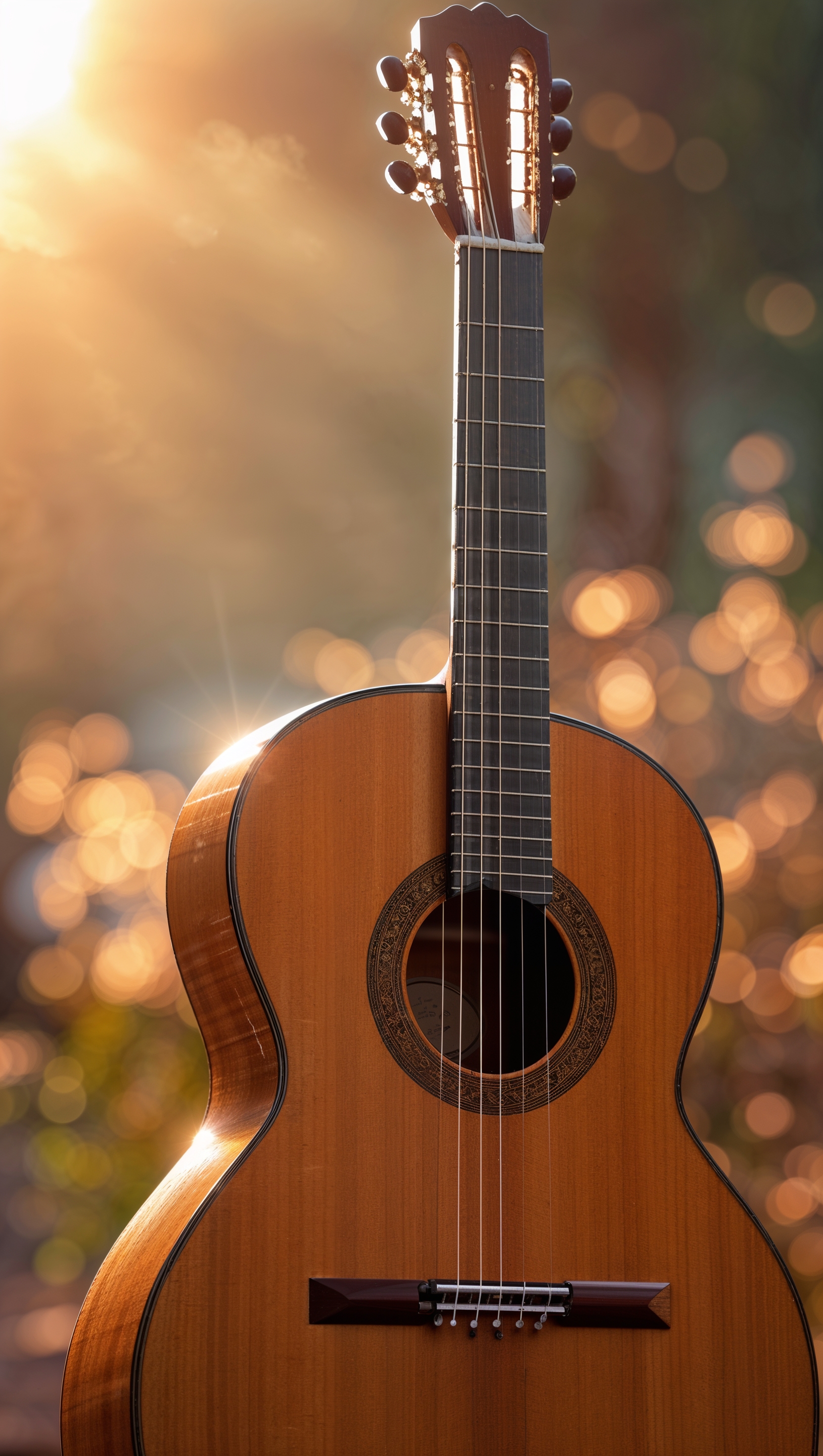1664x2944 A wooden classical guitar in sunset light, iPhone background