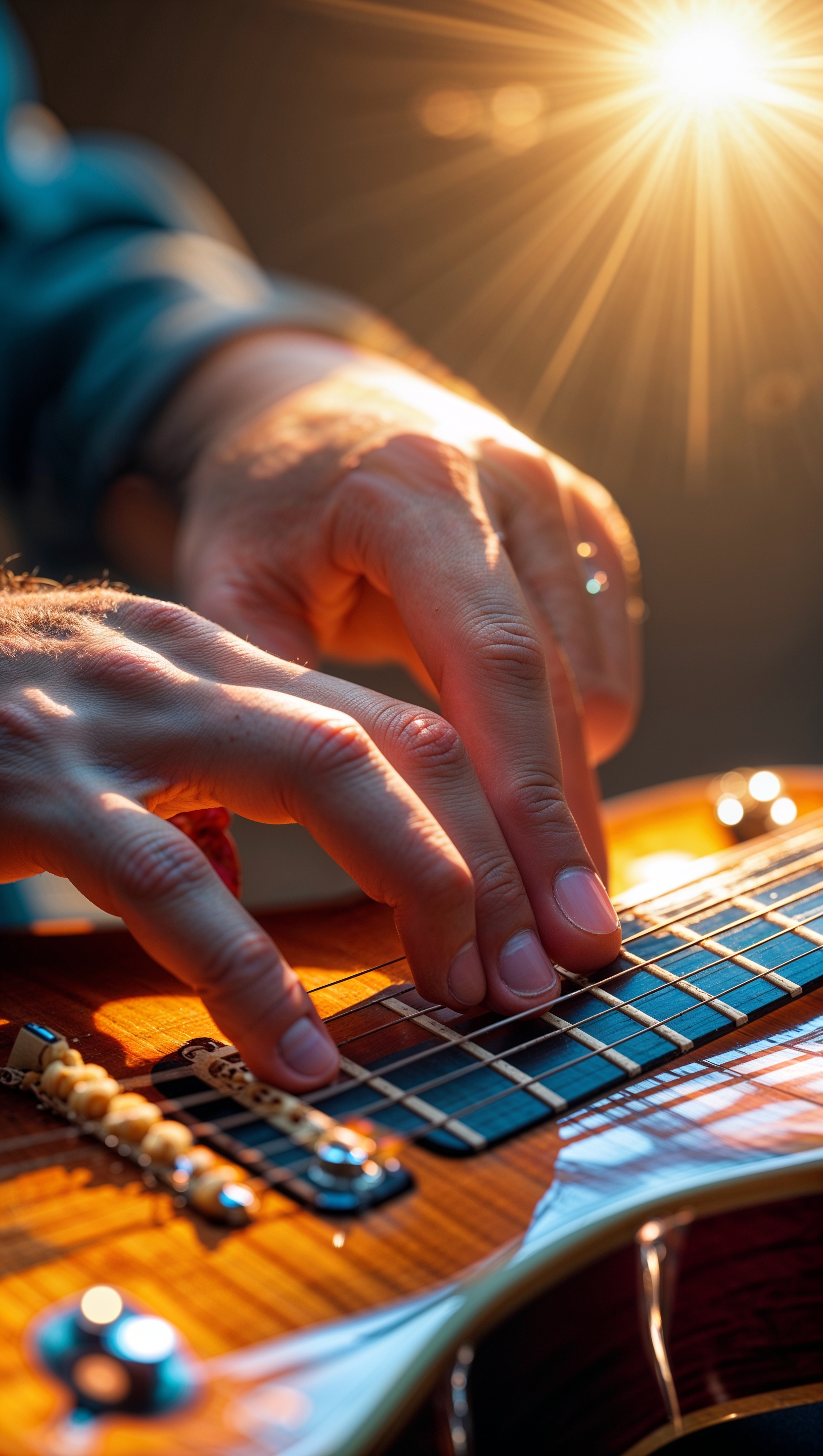 1664x2944 Musician’s hand on guitar strings, close-up, iPhone wallpaper
