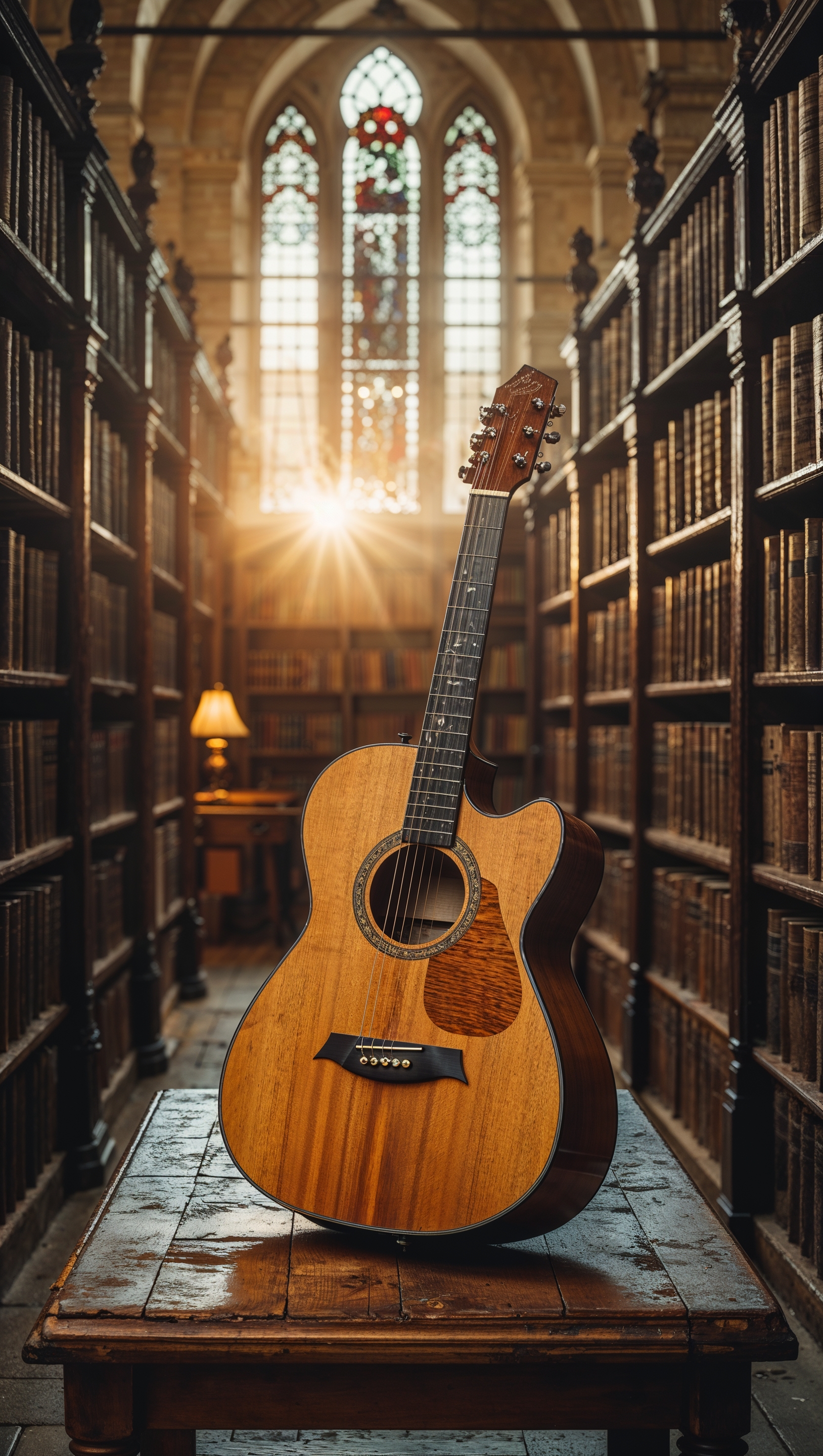 1664x2944 Wooden guitar in an old library, classic iPhone background