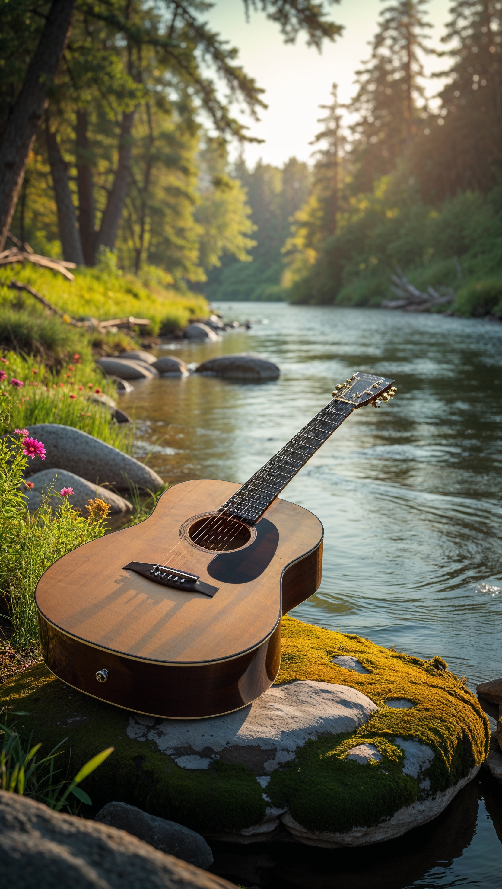 1664x2944 Guitar beside a calm river, nature iPhone background