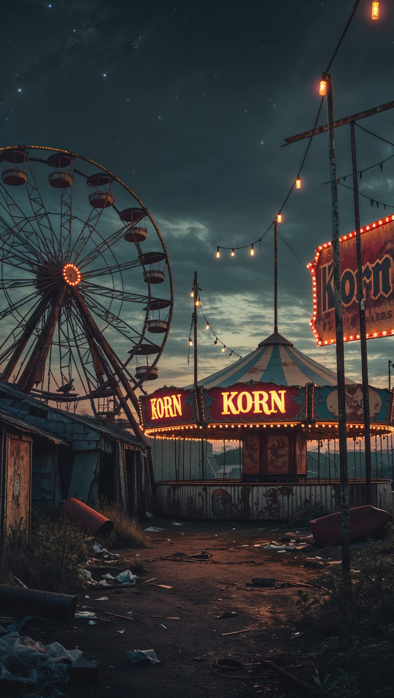 1664x2944 Haunted carnival with Korn signs, creepy mood, iPhone wallpaper