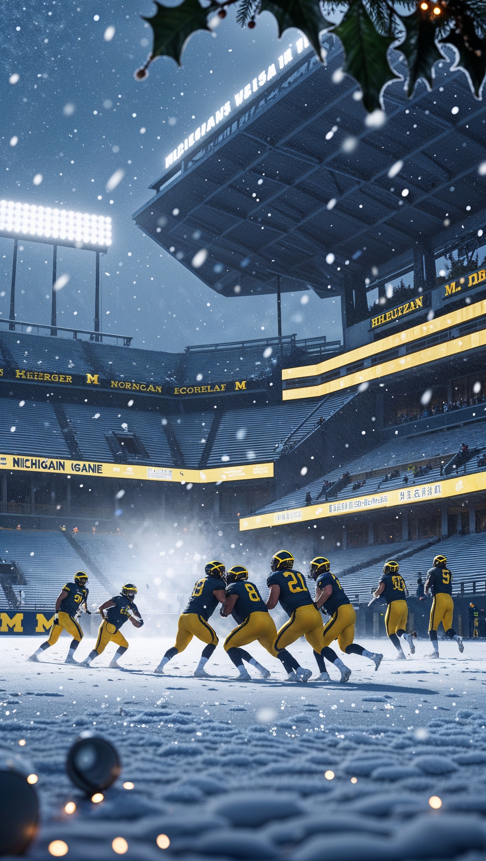 1664x2944 An image of a Michigan football game during snowfall with a Christmas atmosphere