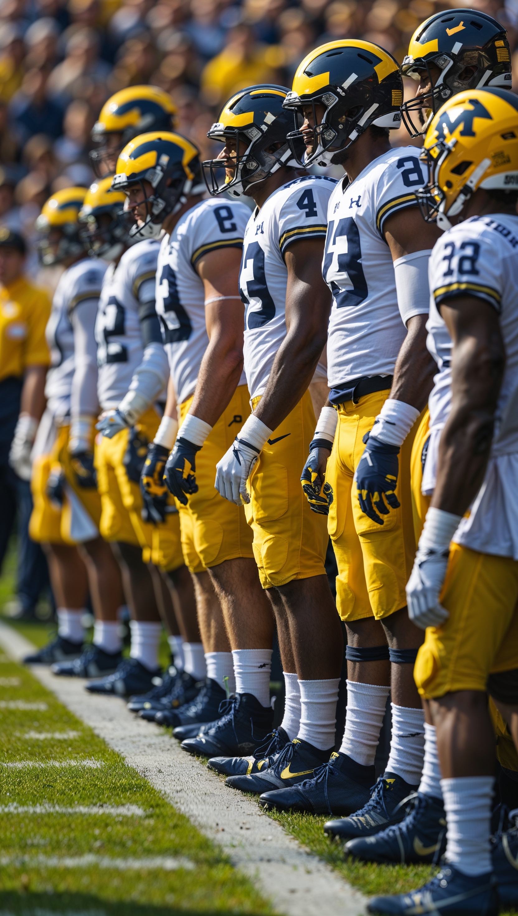 1664x2944 An image of the Michigan football bench with players preparing for the game