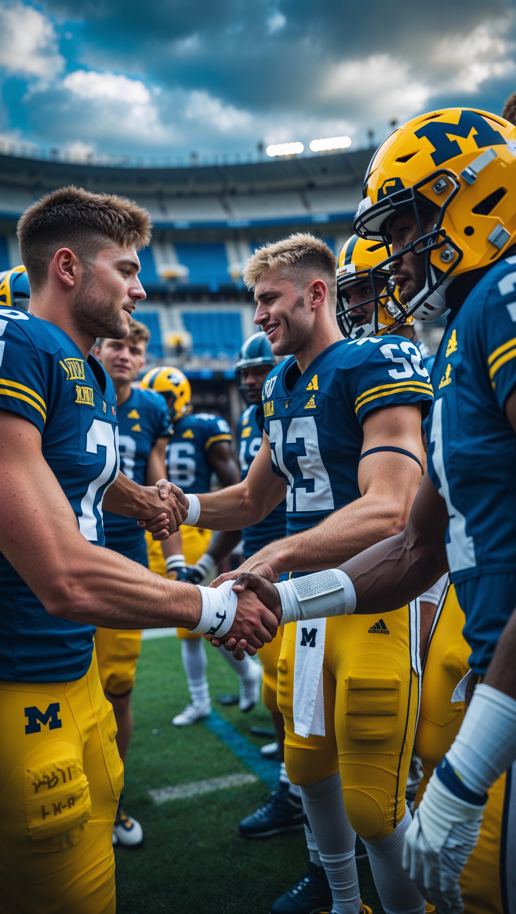 1664x2944 An image of Michigan football players shaking hands with opponents after the game