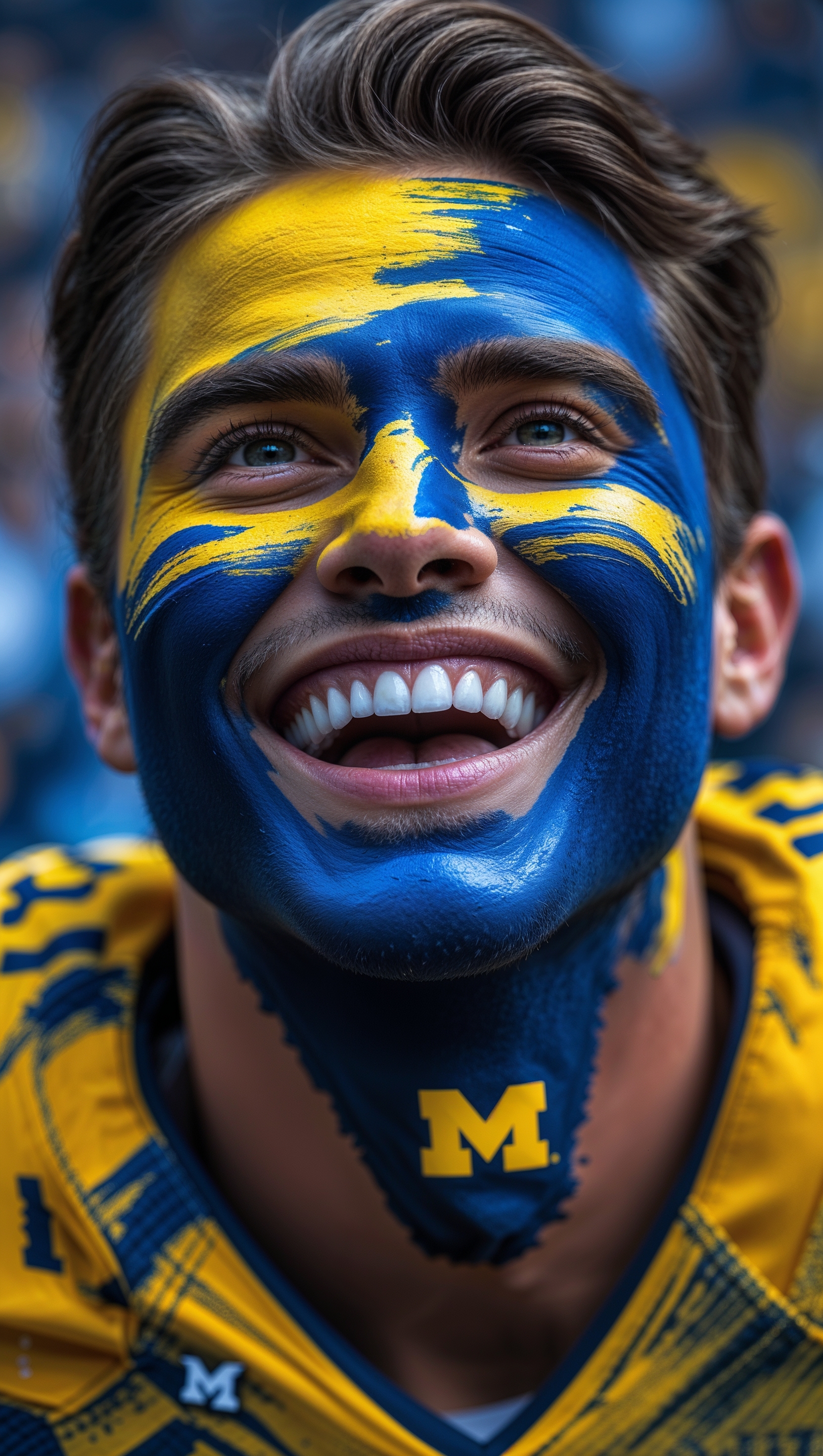 1664x2944 An image of a fan with their face painted in Michigan team colors