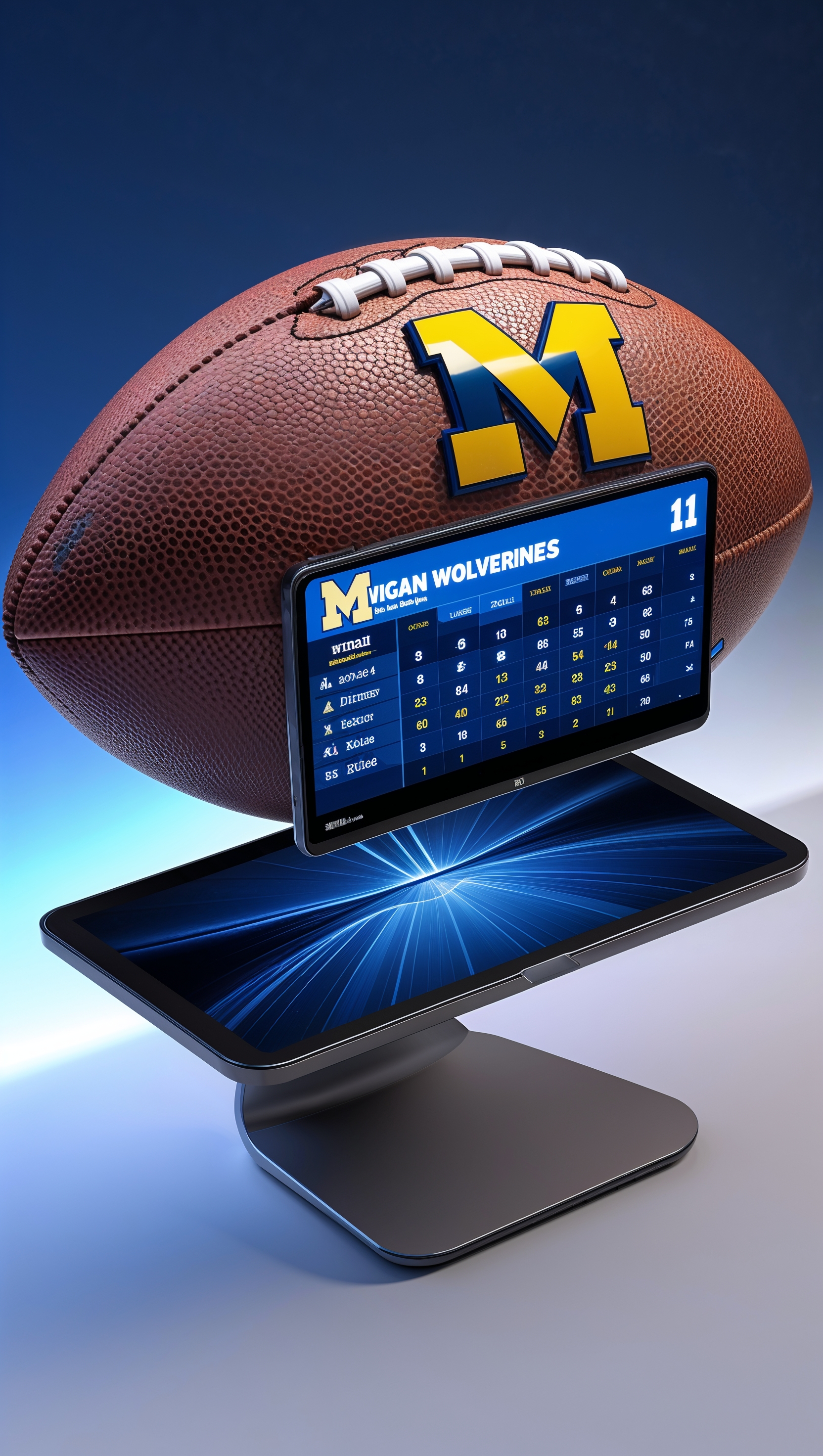 1664x2944 An image of a Michigan football with a monitor showing the game score