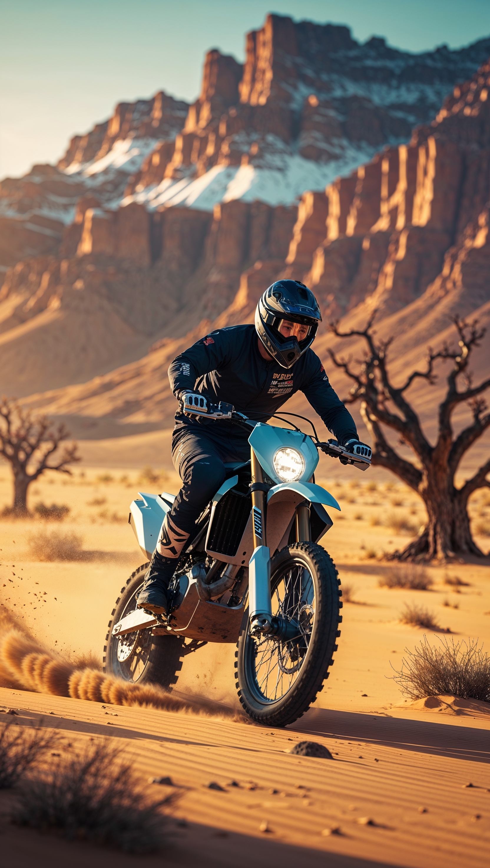 1664x2944 A dirt bike riding through a desert with tall mountains in the background, for an iPhone wallpaper