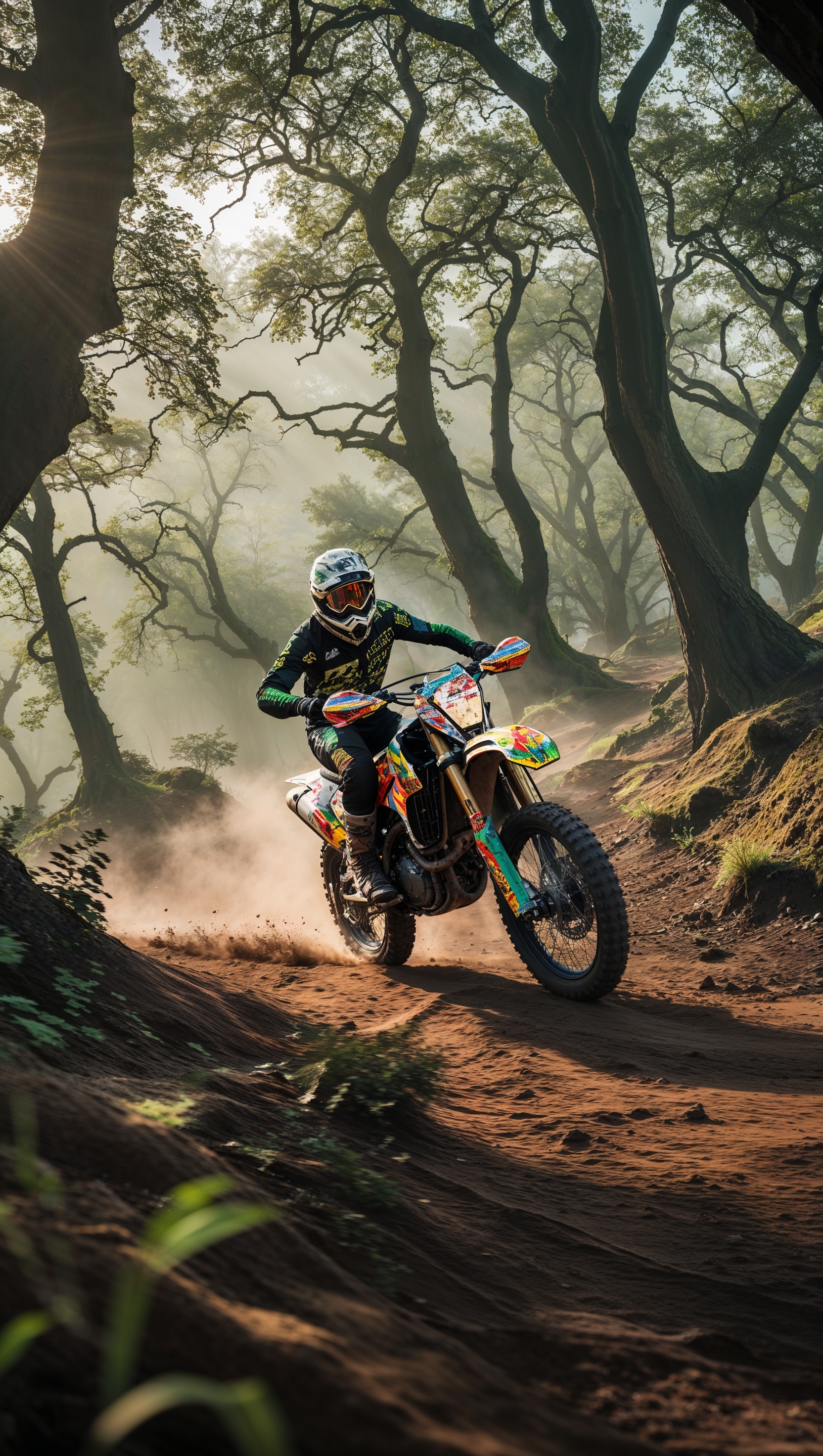 1664x2944 A dirt bike riding on a forest trail full of trees, for an iPhone wallpaper