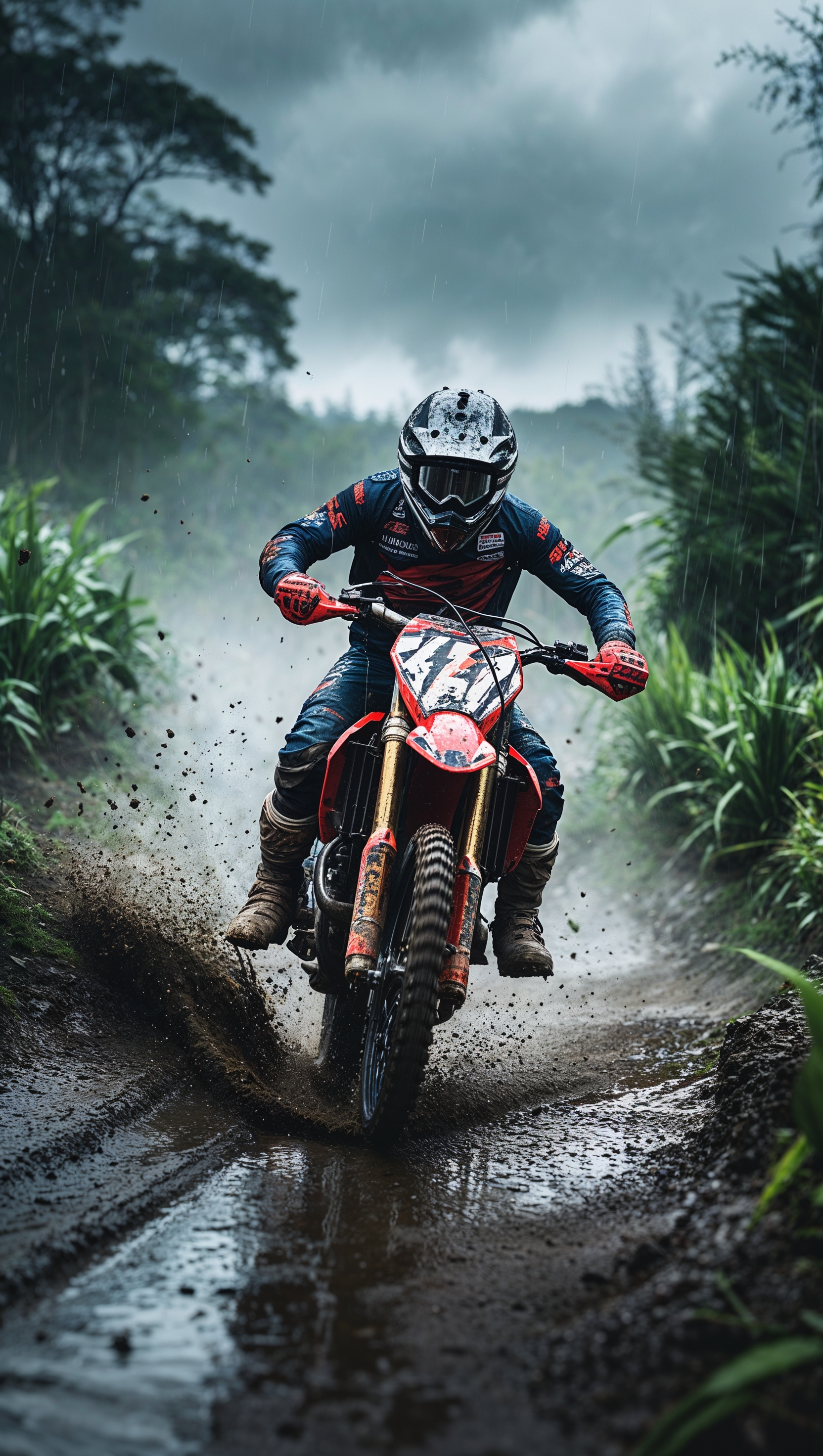 1664x2944 An image of a dirt bike riding on a rain-soaked trail, for an iPhone wallpaper