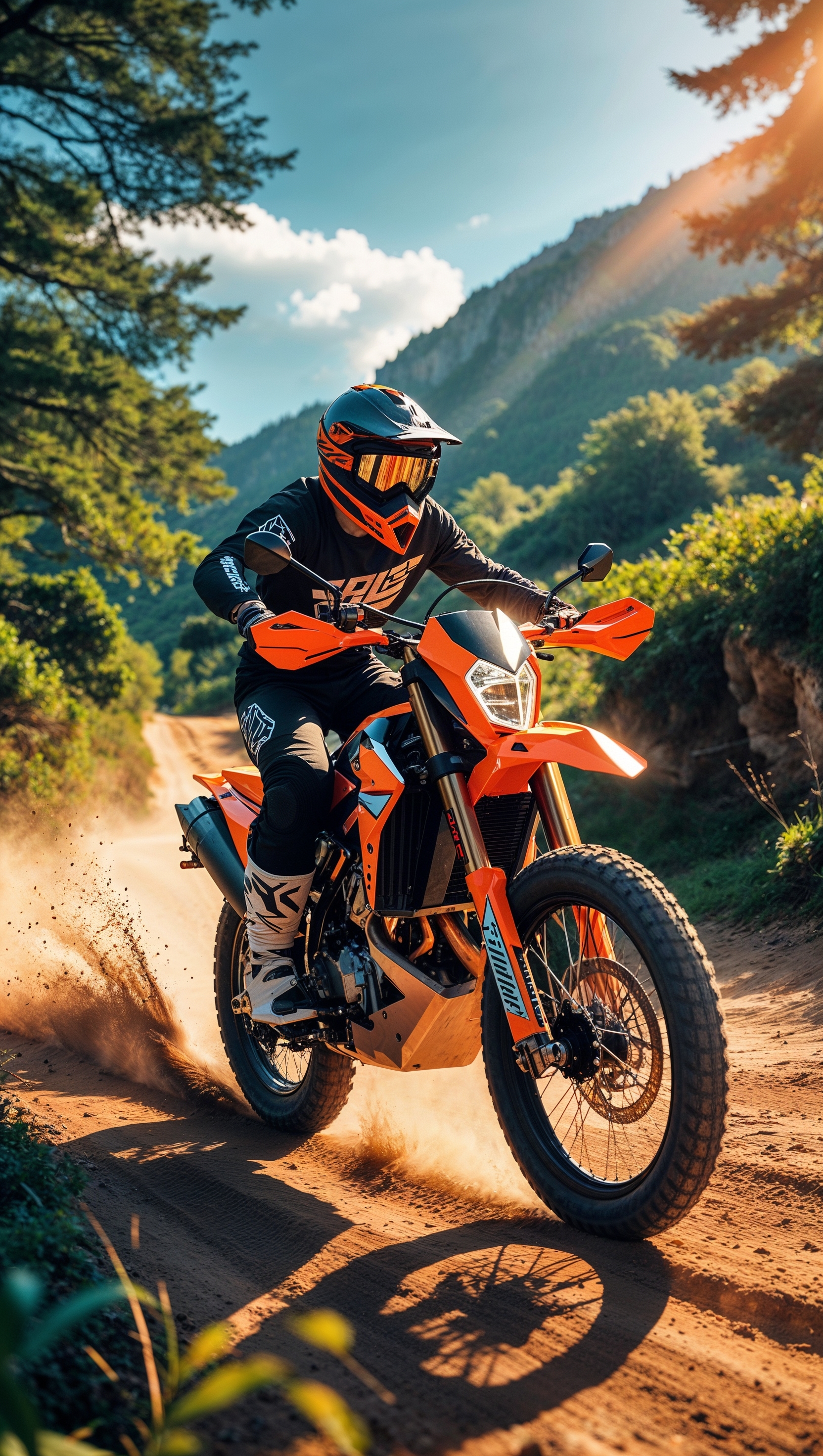 1664x2944 An image of a dirt bike riding on a mountain path with sunlight, for an iPhone wallpaper