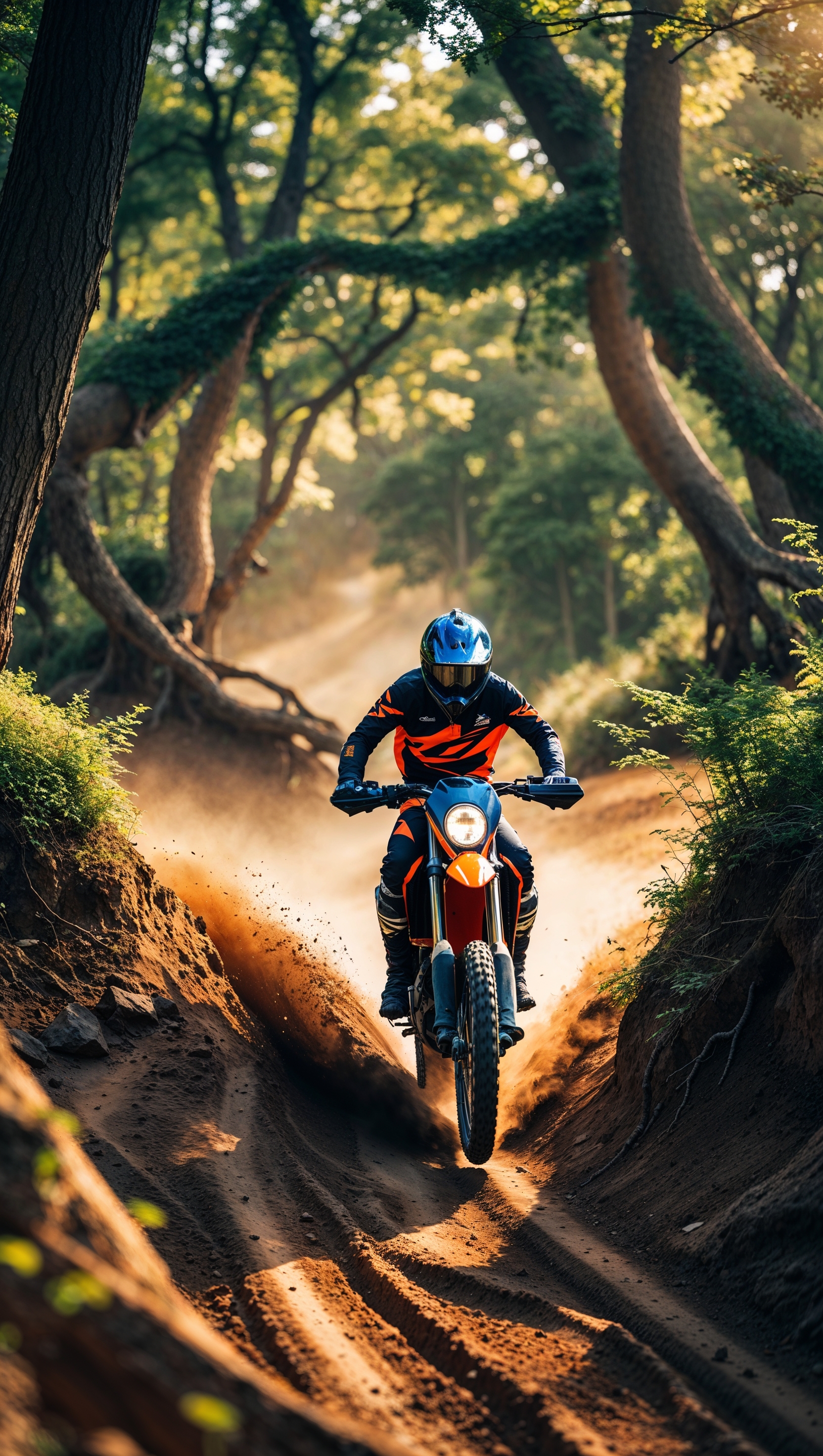 1664x2944 A dirt bike riding through forest trails at sunset, for an iPhone wallpaper