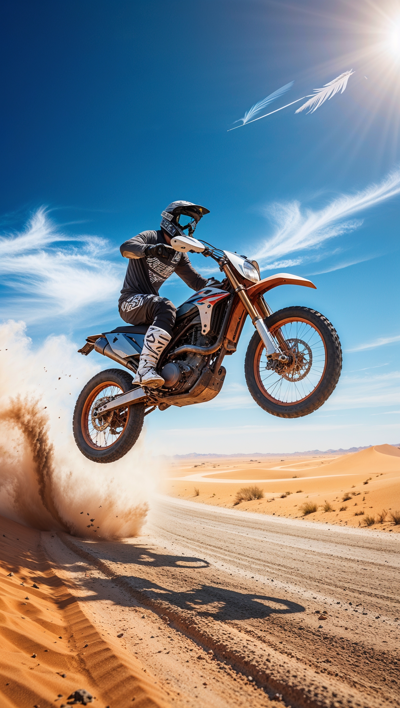 1664x2944 A dirt bike riding through a desert road with a bright blue sky, for an iPhone wallpaper
