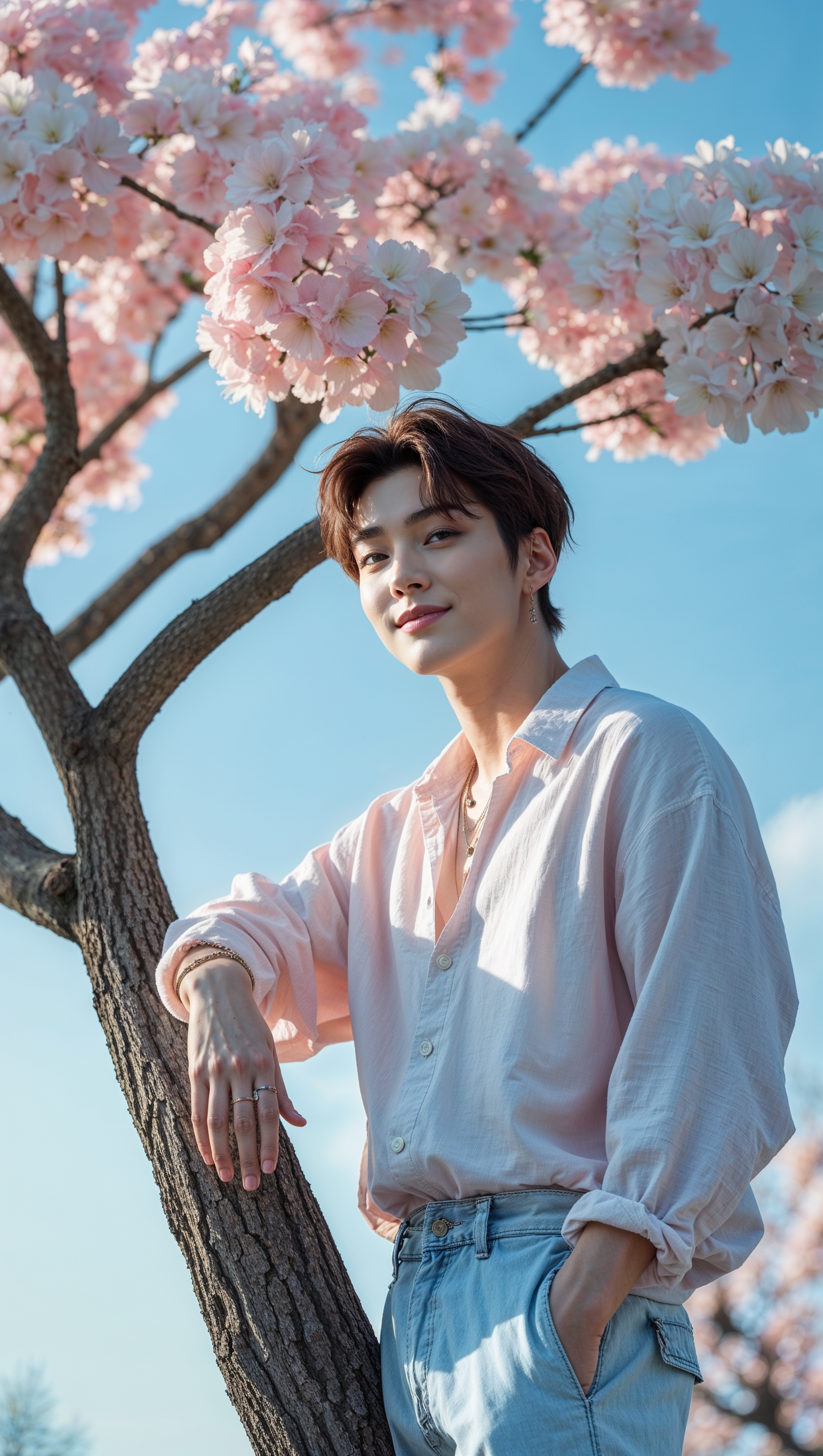 1664x2944 Design an iPhone wallpaper with Jungkook next to a flowering tree