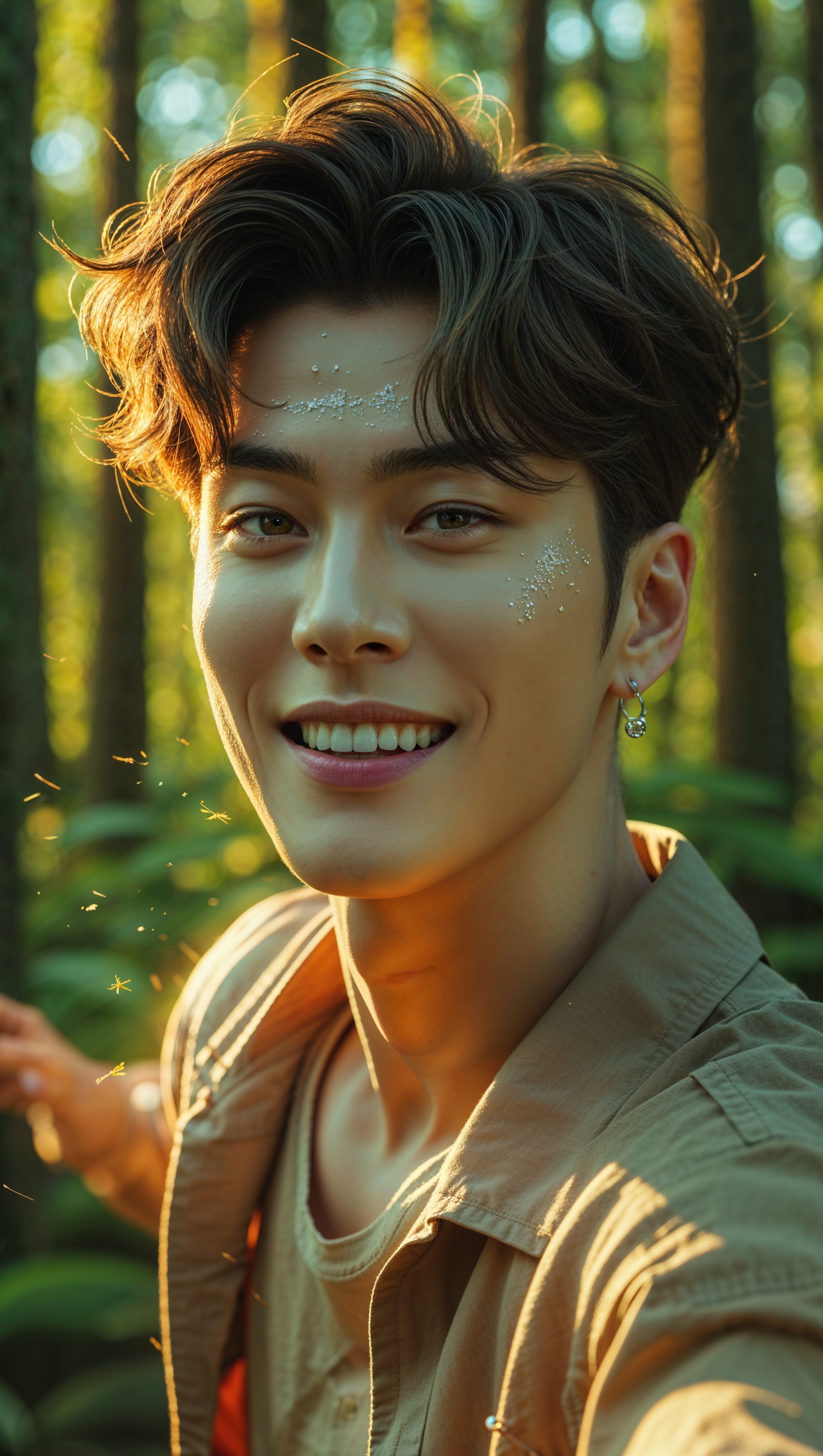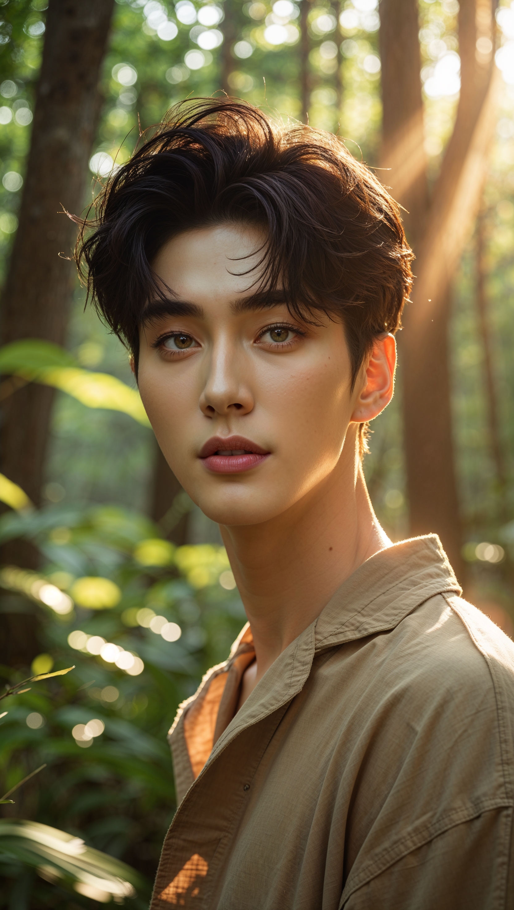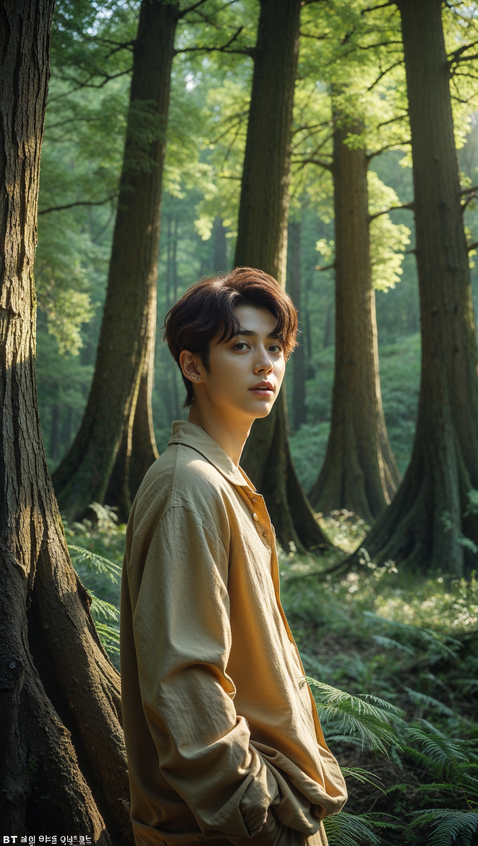1664x2944 An image of Jungkook in a forest with sunlight streaming through