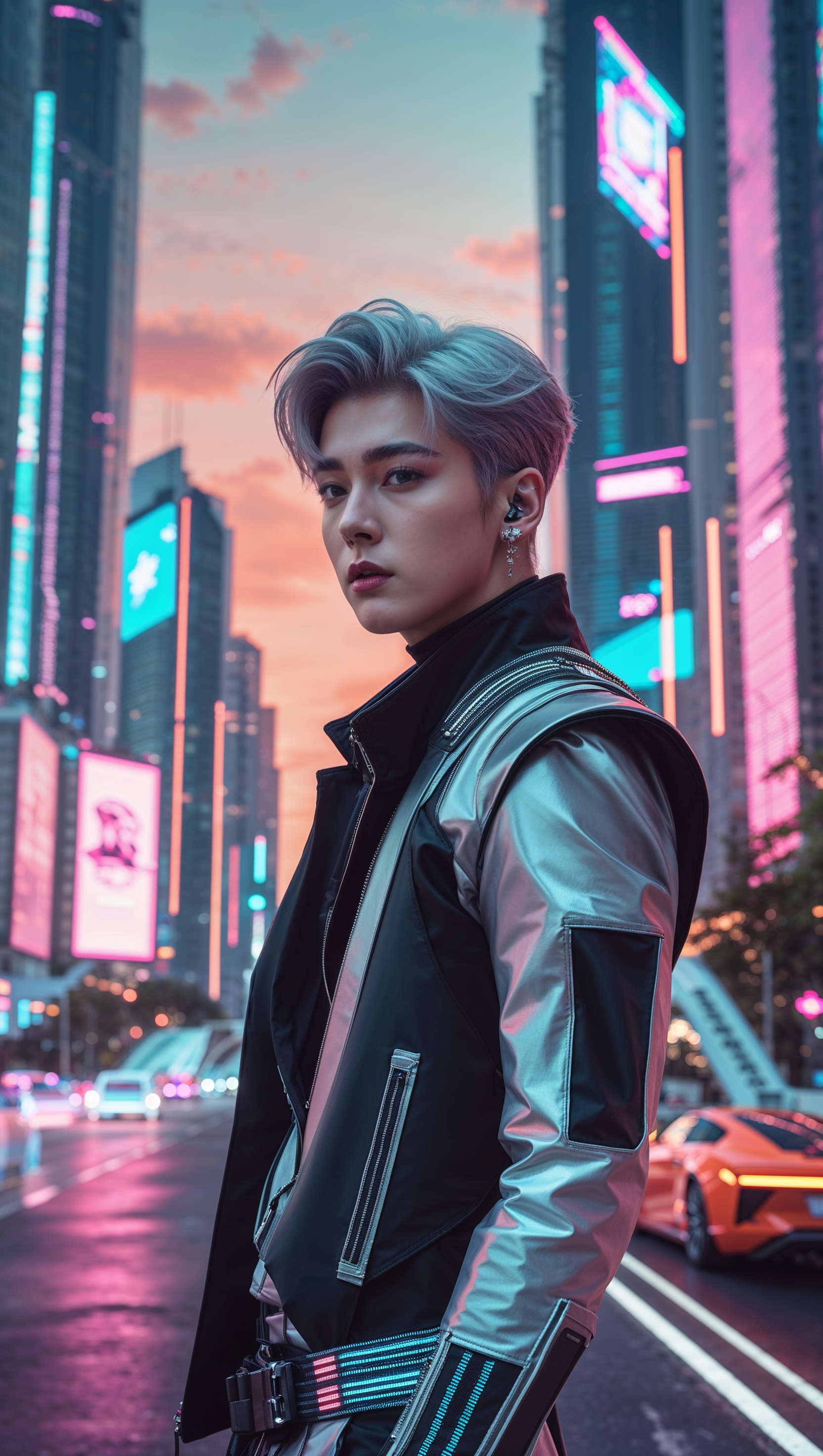 1664x2944 Create a wallpaper with Jungkook and a futuristic city in the background