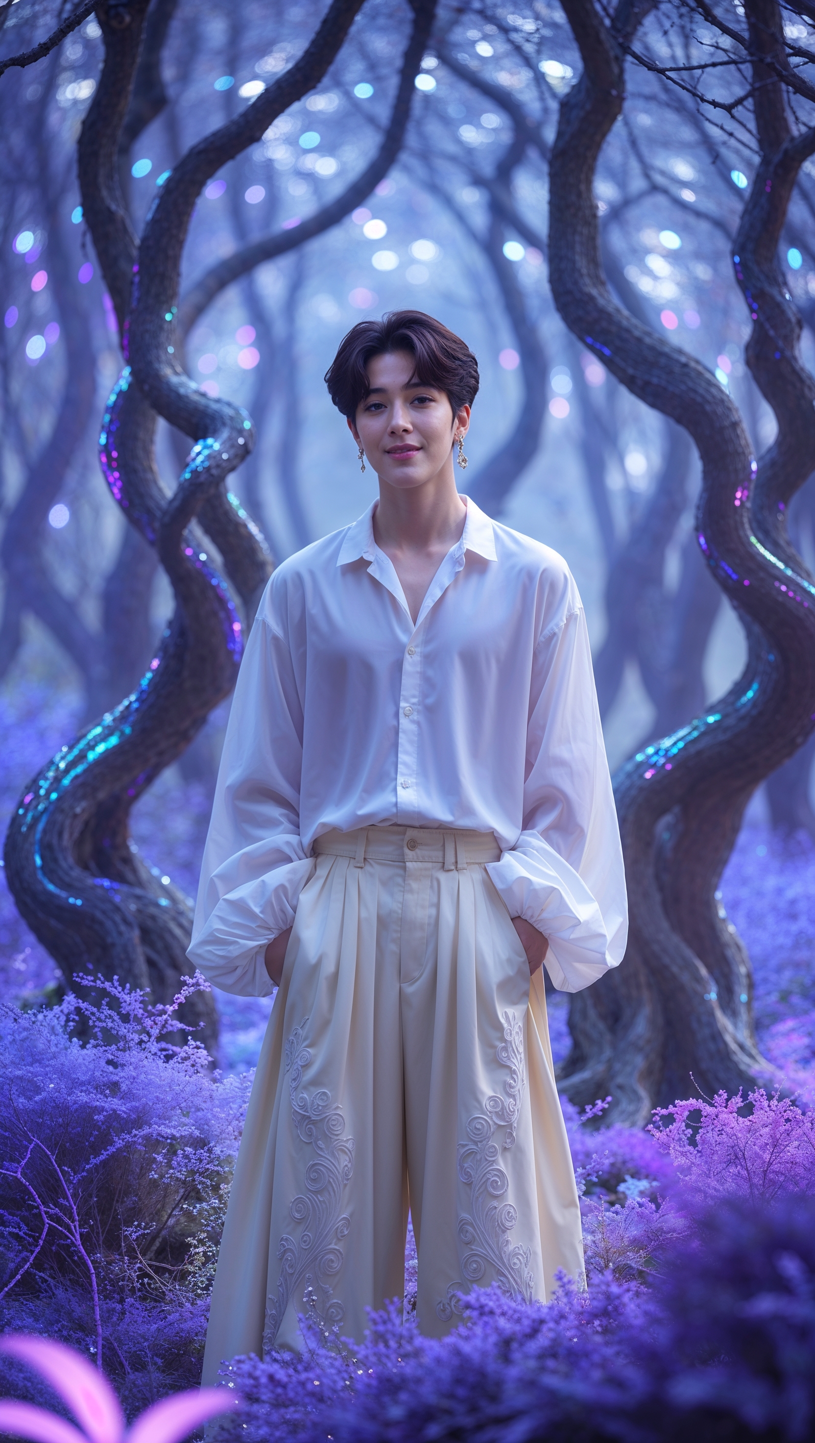 1664x2944 Design a wallpaper with Jungkook in a fantasy space with strange trees
