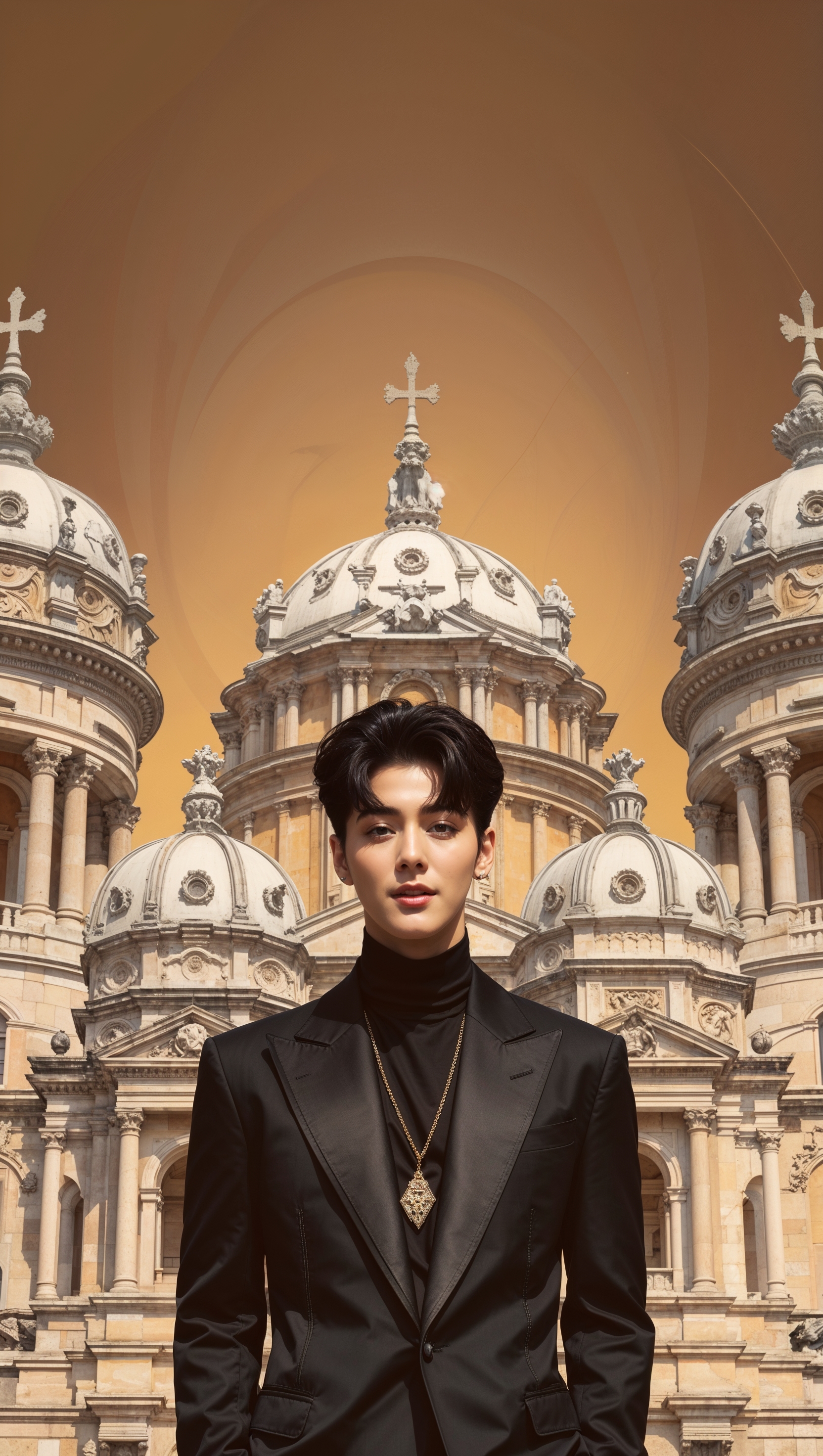 1664x2944 Design a wallpaper with Jungkook surrounded by royal domes and historical architecture