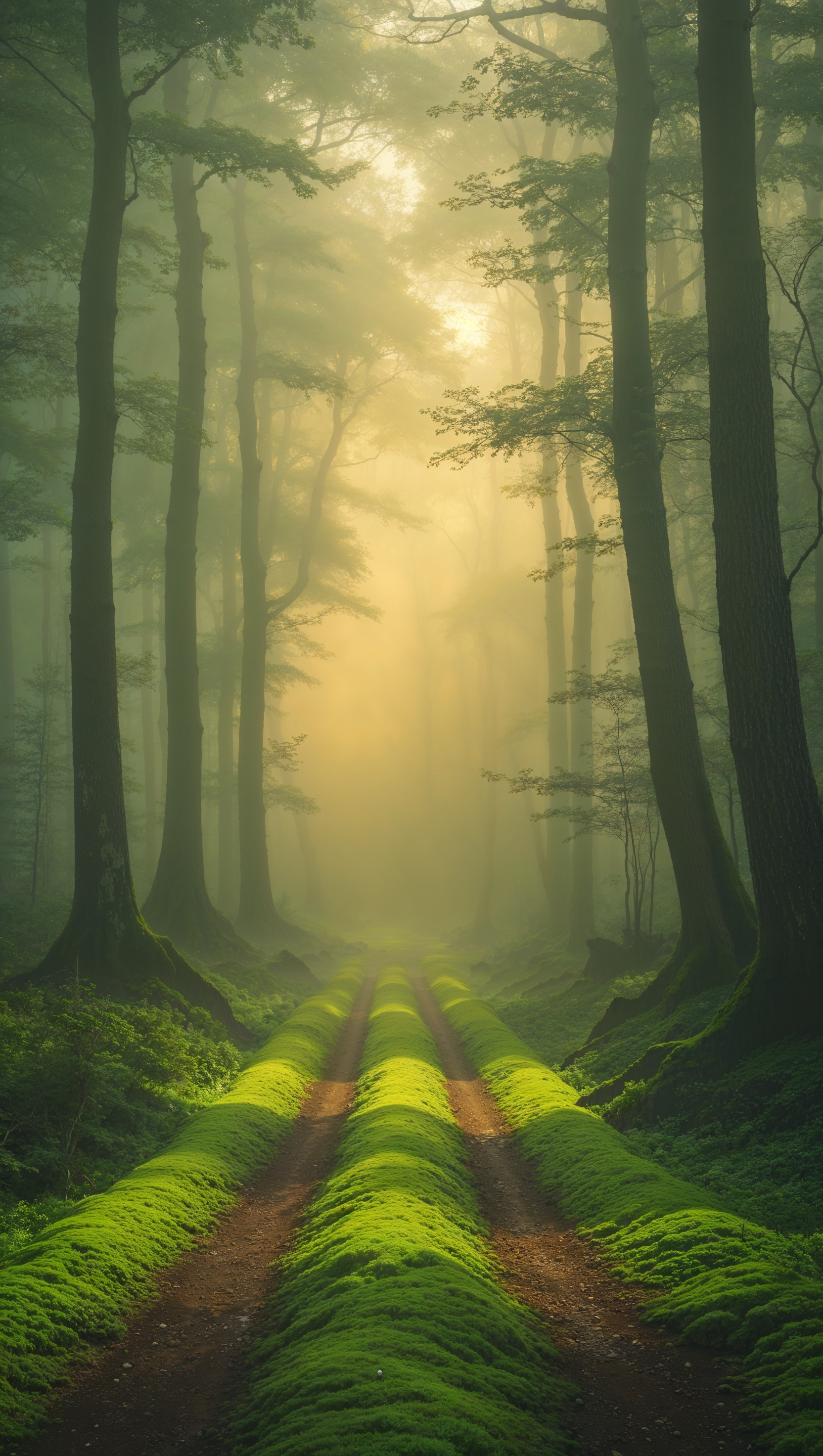 1664x2944 A peaceful forest path covered in golden mist – nirvana journey concept