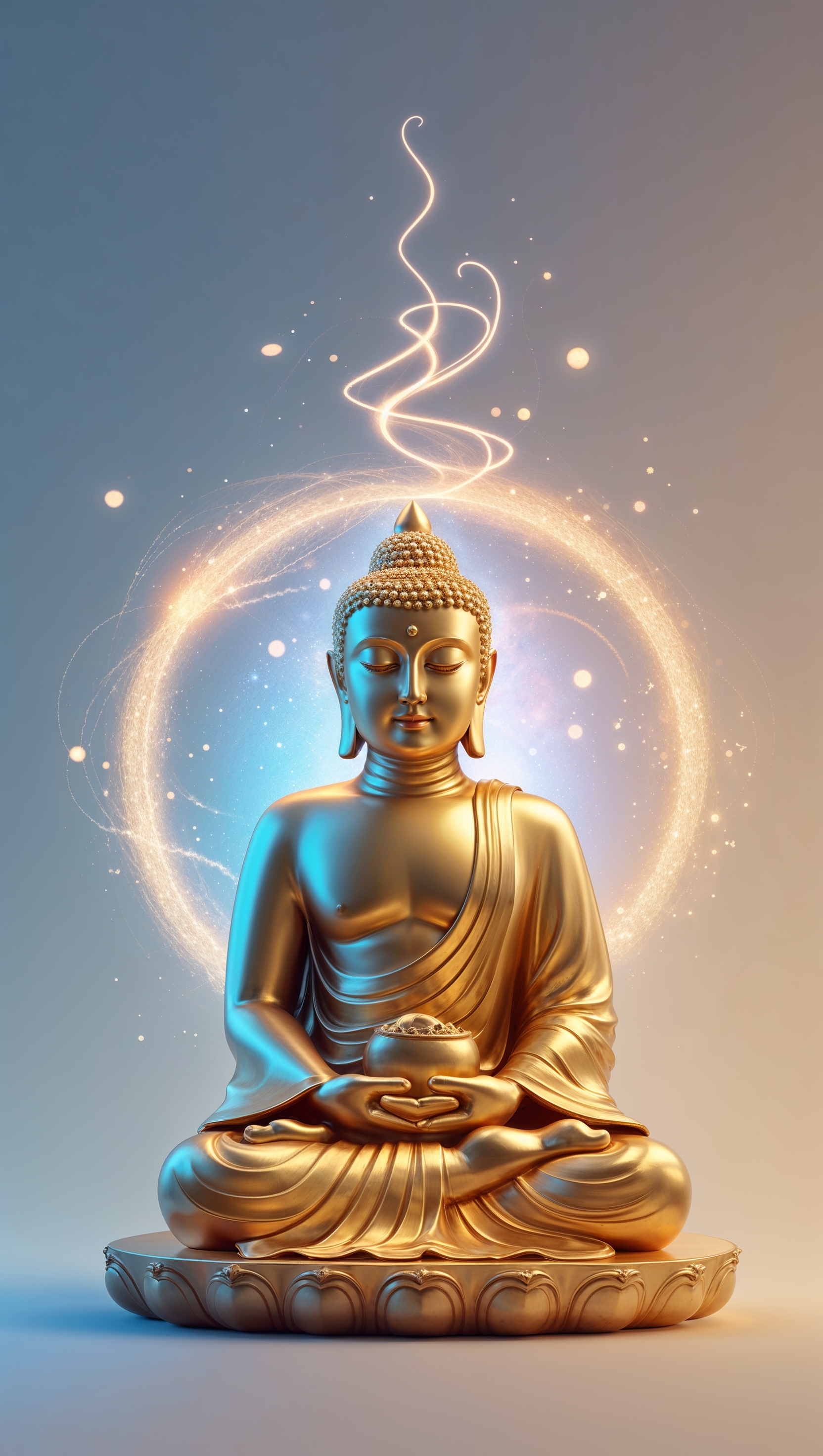 1664x2944 Golden Buddha in deep meditation, surrounded by glowing energy, peaceful nirvana theme – iPhone background