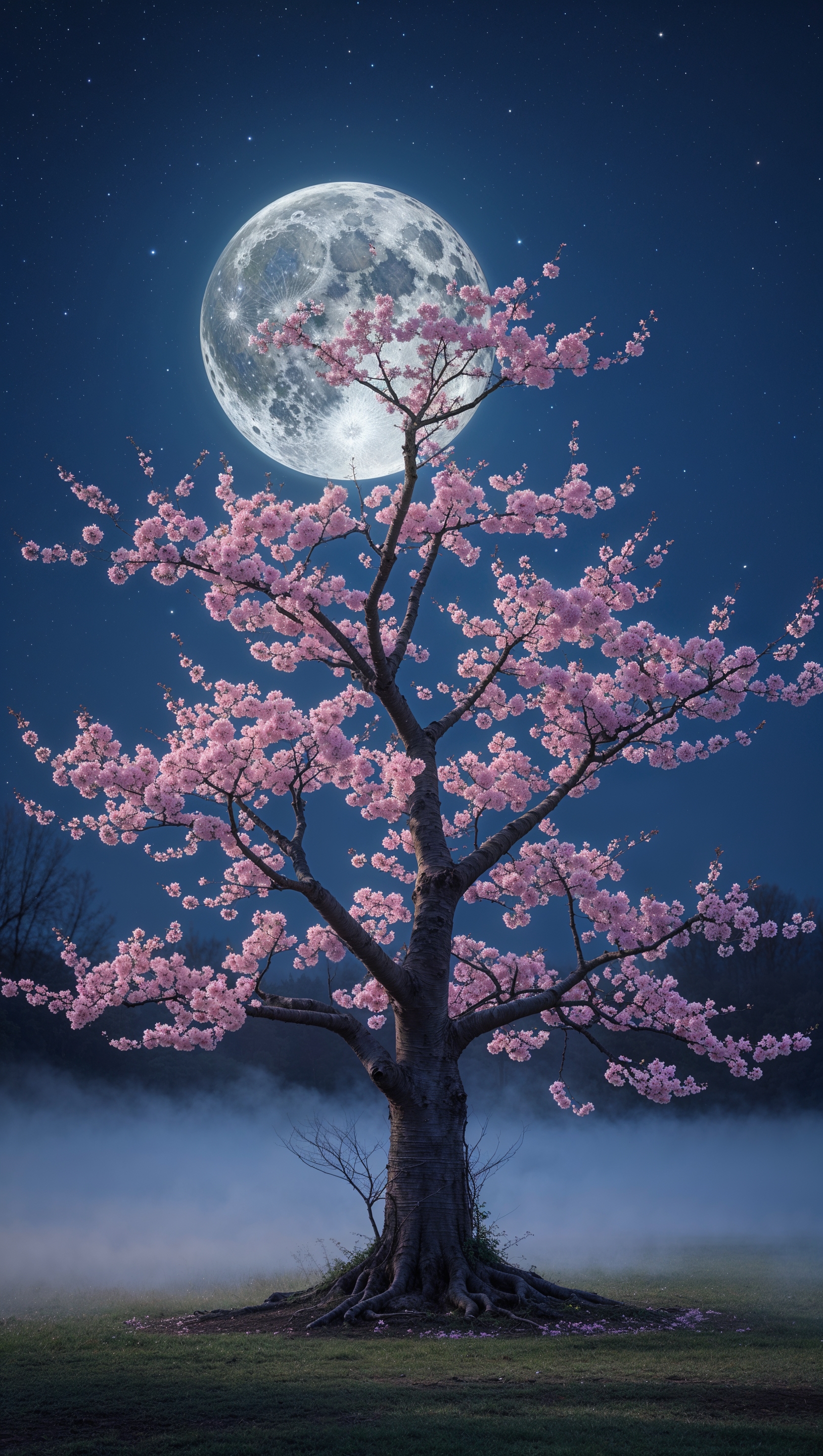 1664x2944 Cherry blossom tree under moonlight – peaceful and meditative