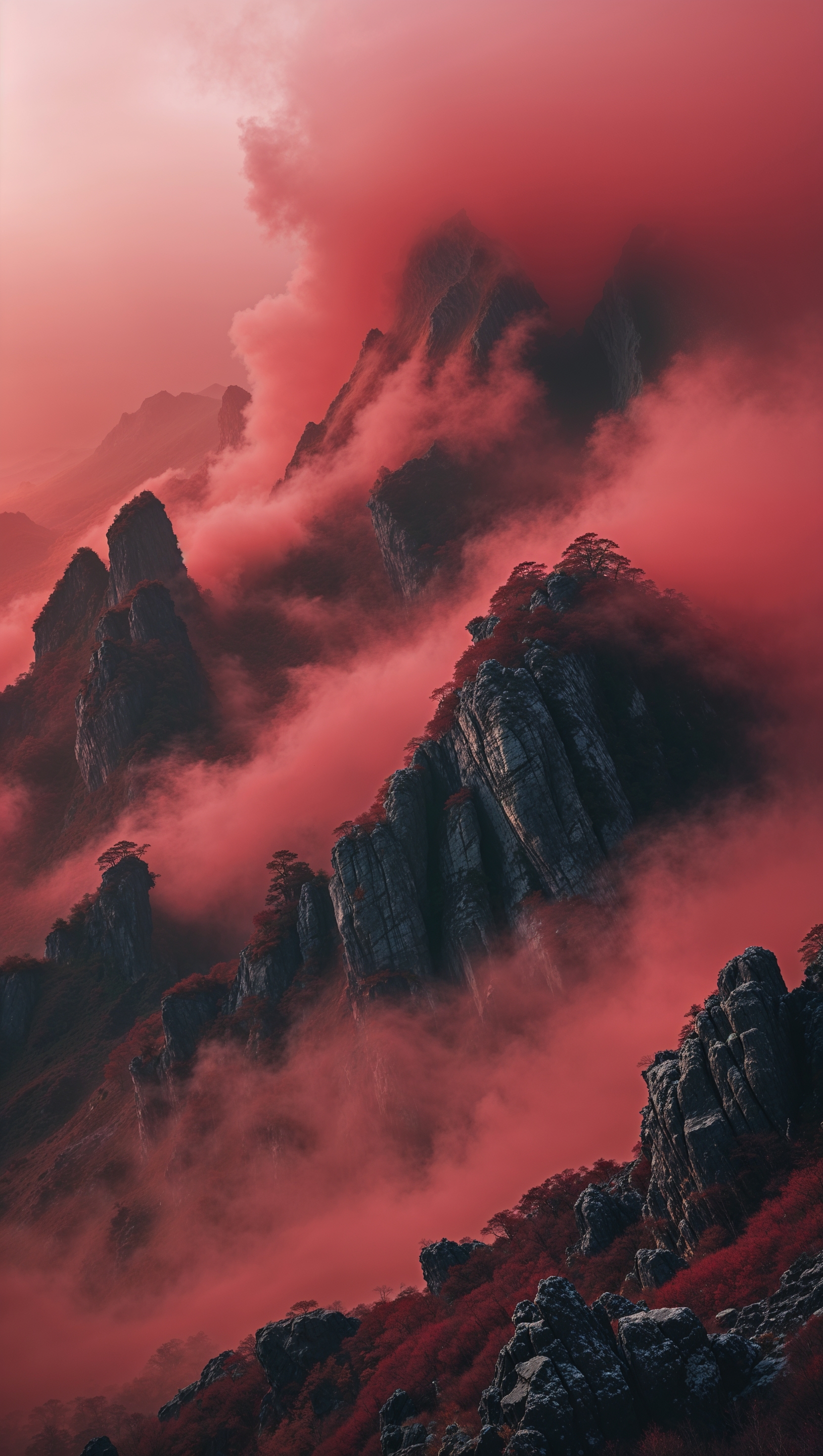 1664x2944 Mountains covered in red mist with realistic and mysterious tone