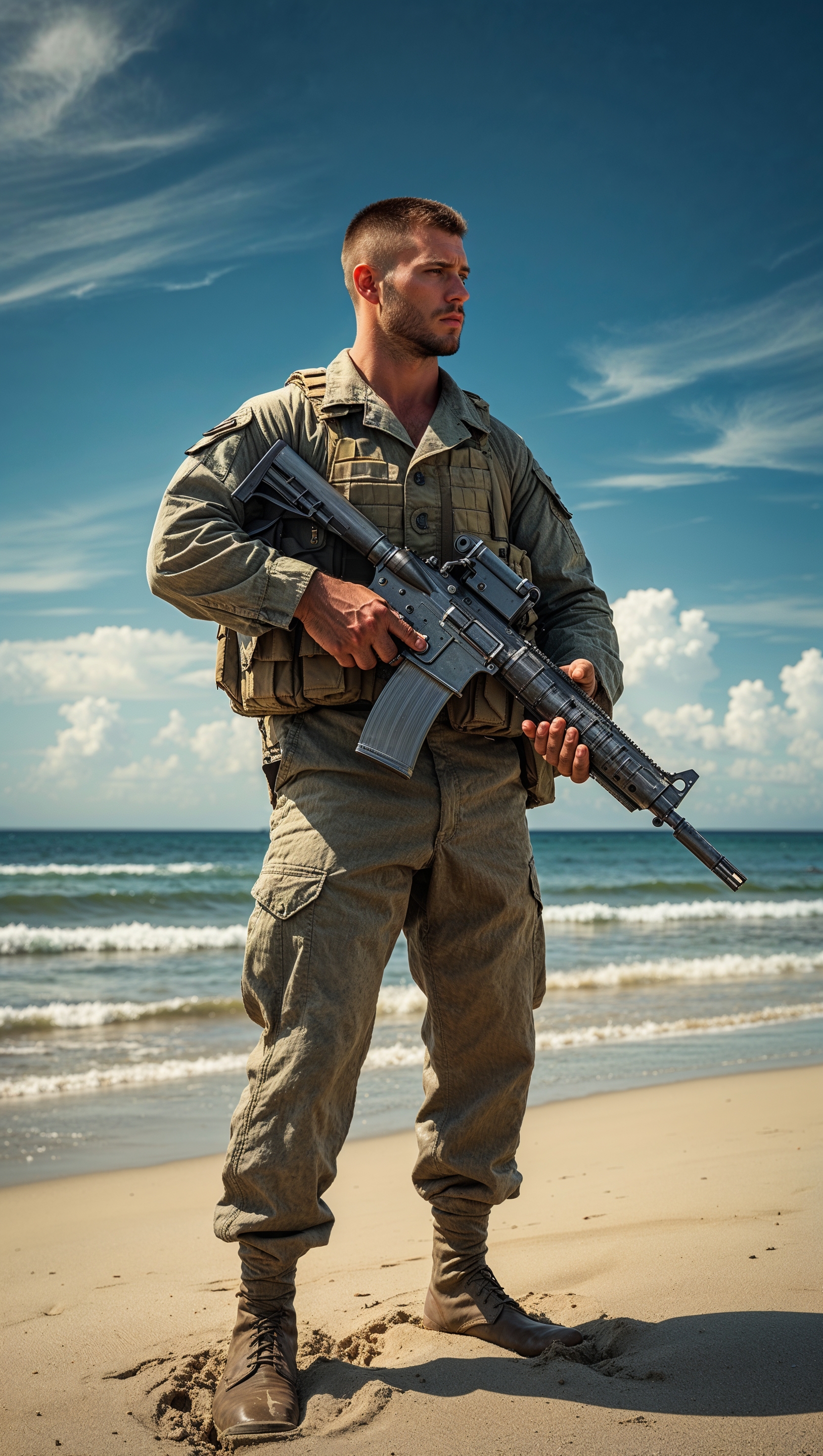 1664x2944 A marine soldier holding a weapon in his hands on the beach
