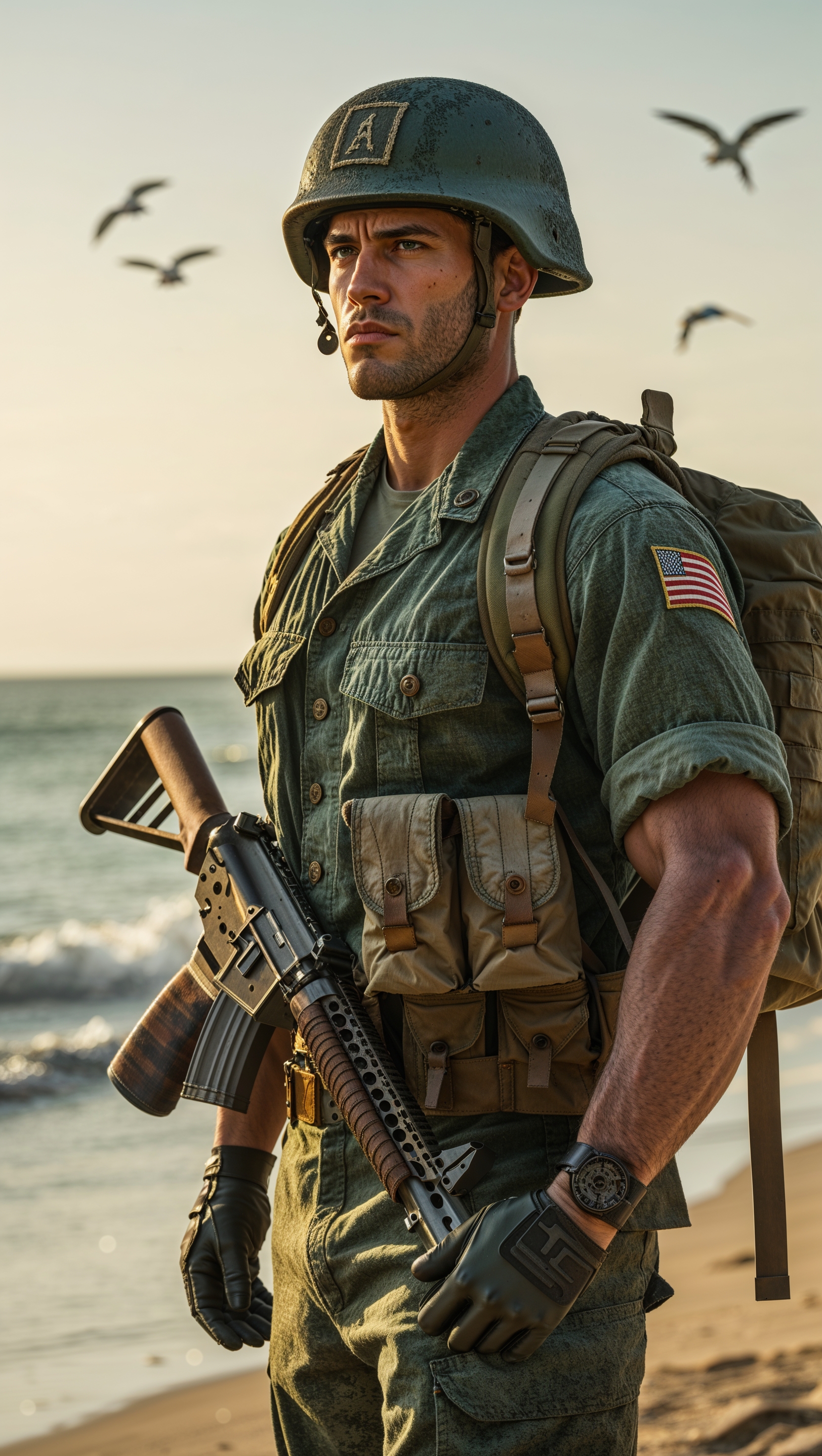 1664x2944 A marine soldier fully equipped patrolling the beach