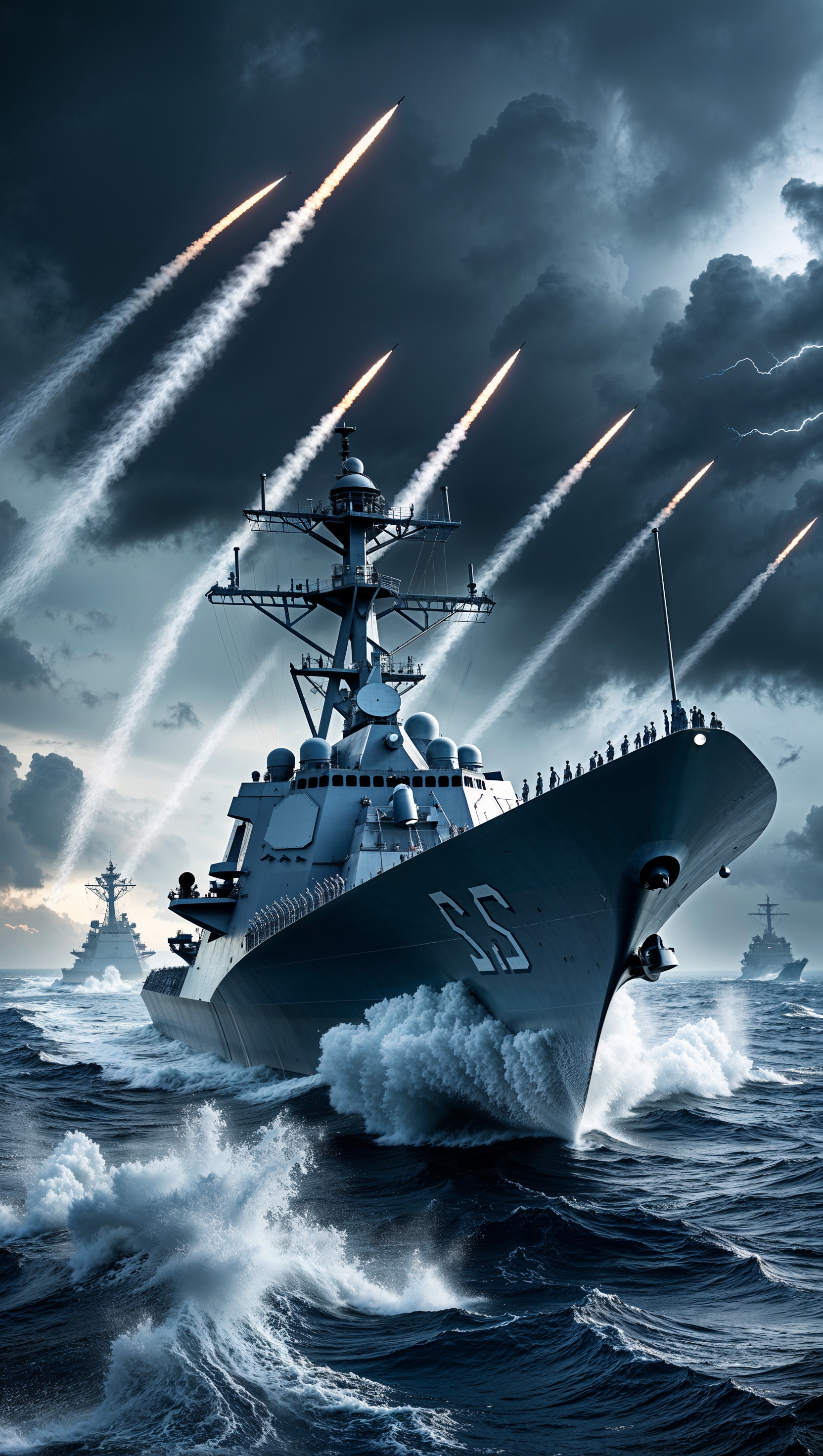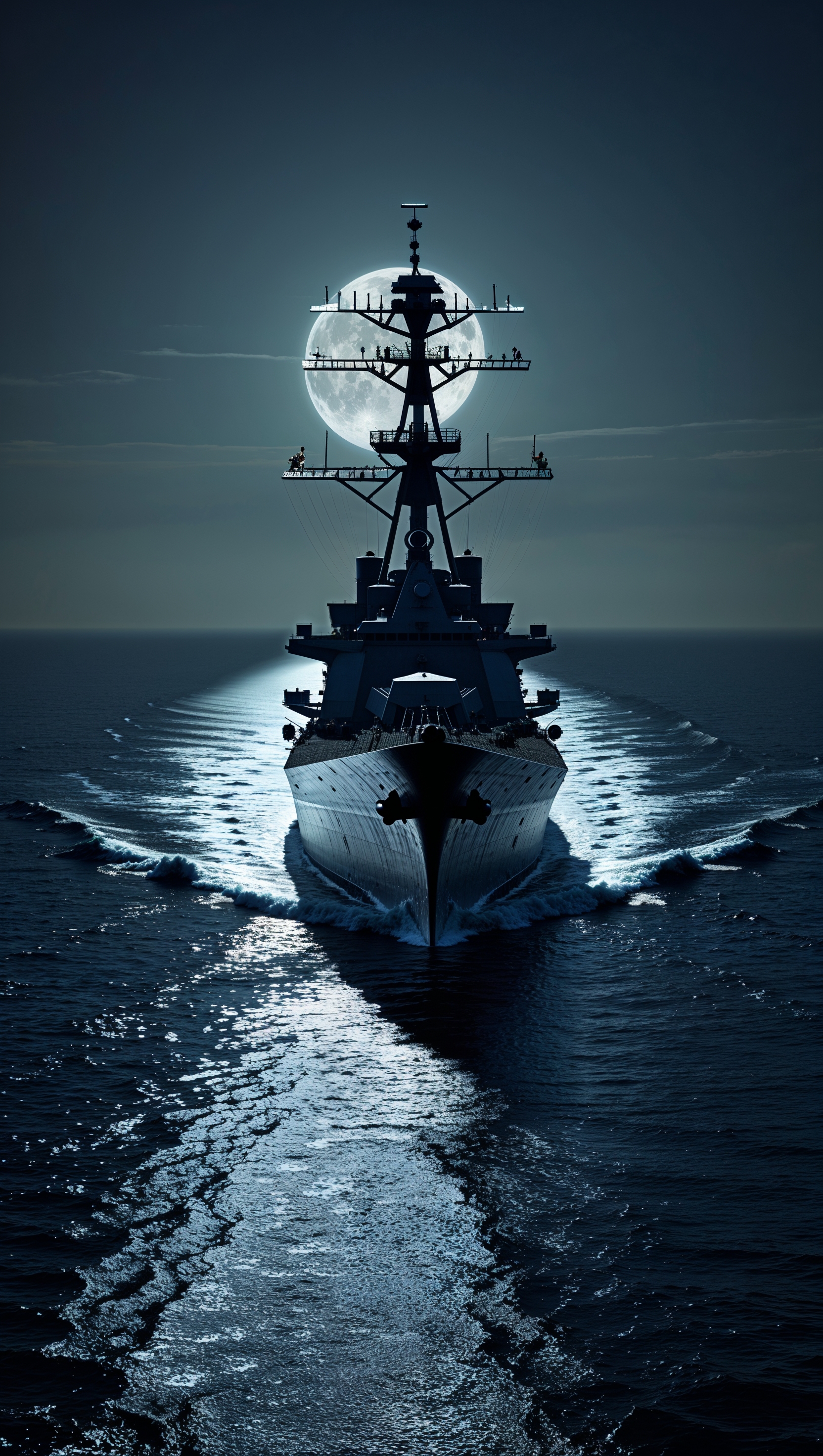 1664x2944 An image of a warship moving in the ocean with a dark and stormy sky