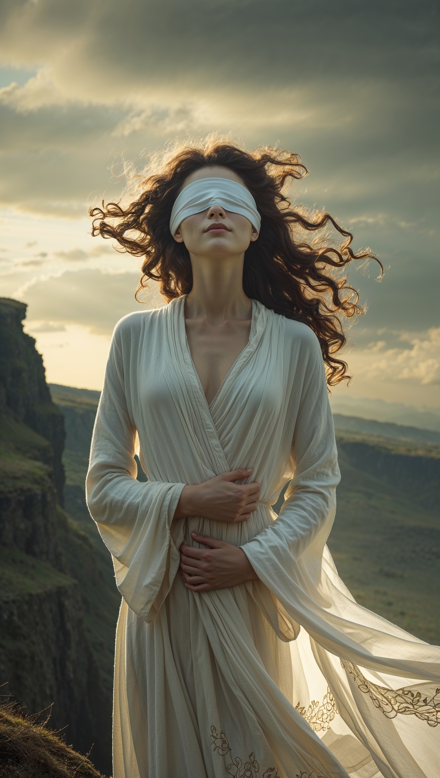 1664x2944 A blindfolded woman standing on a cliff, surrendering to fate
