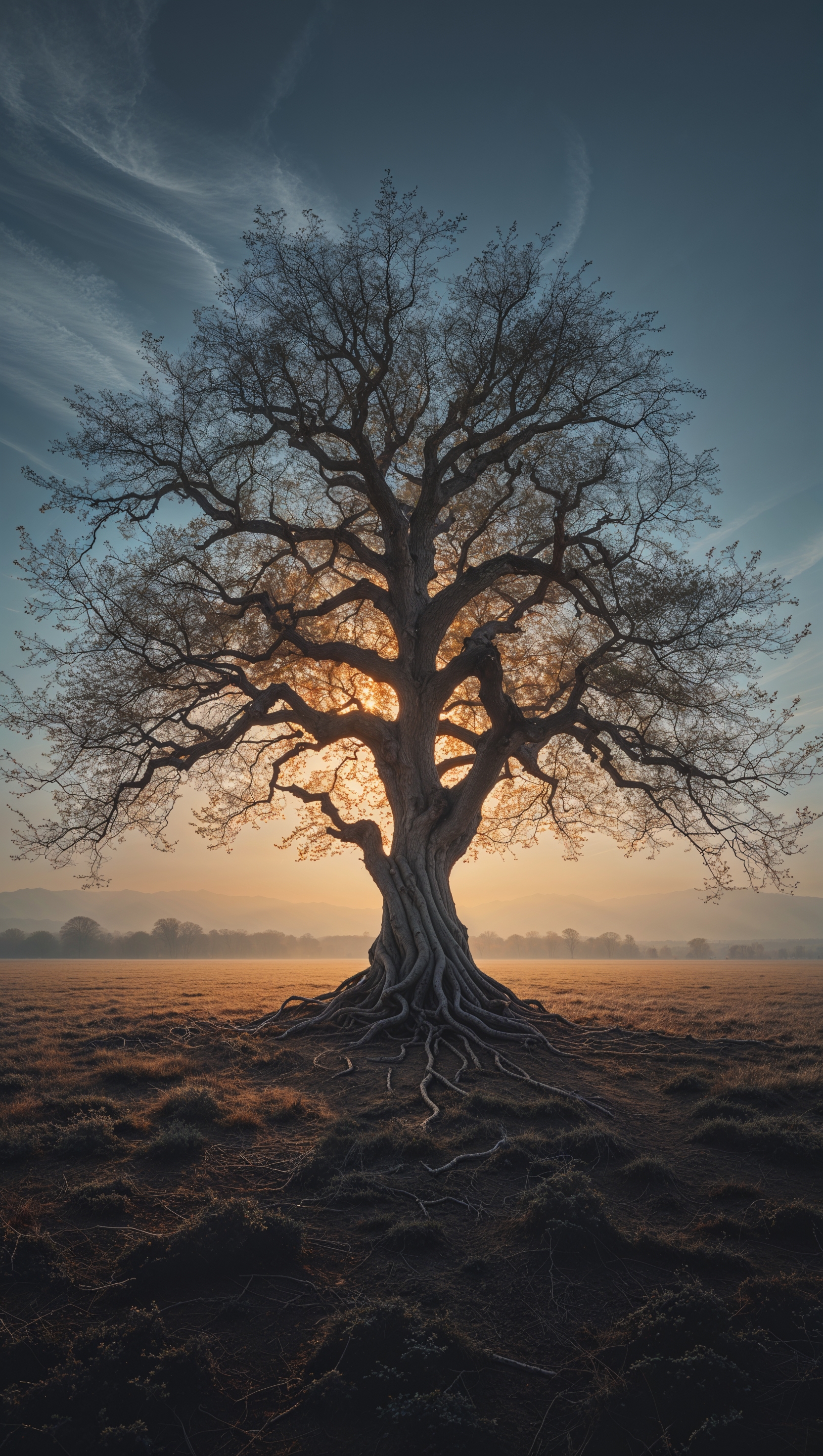 1664x2944 A tree in the center of a dark and light field, symbolizing destiny choice
