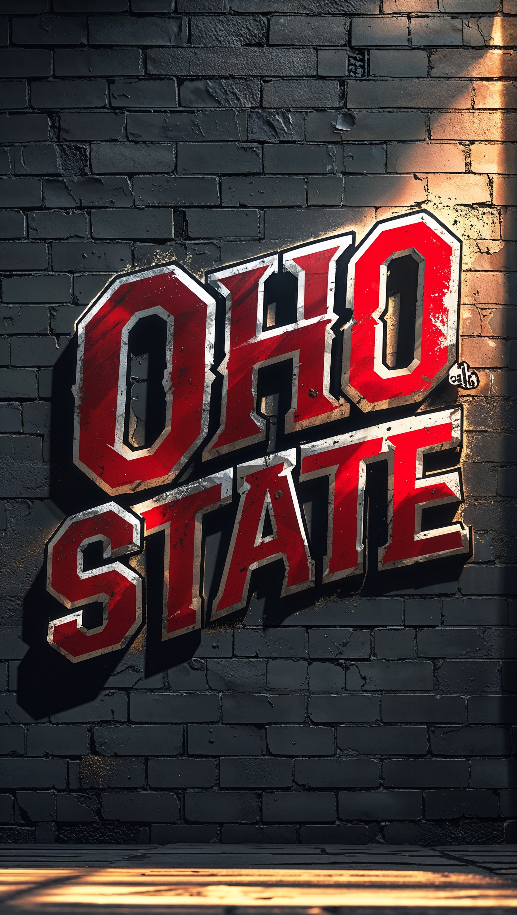 1664x2944 Ohio State text in graffiti style over brick wall background, urban iPhone wallpaper