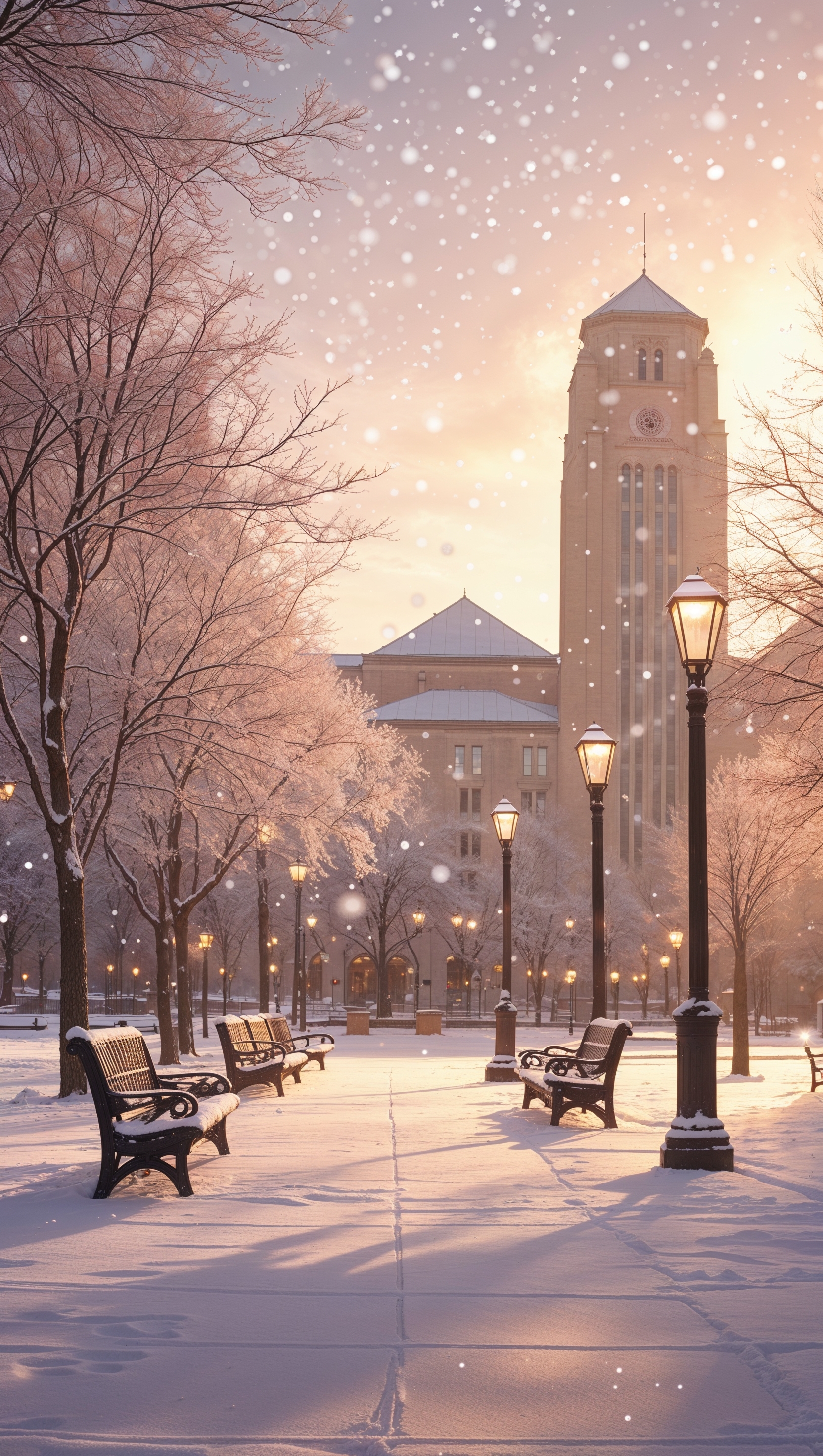 1664x2944 Snow-covered Ohio State campus in winter, quiet and calm scene, iPhone wallpaper