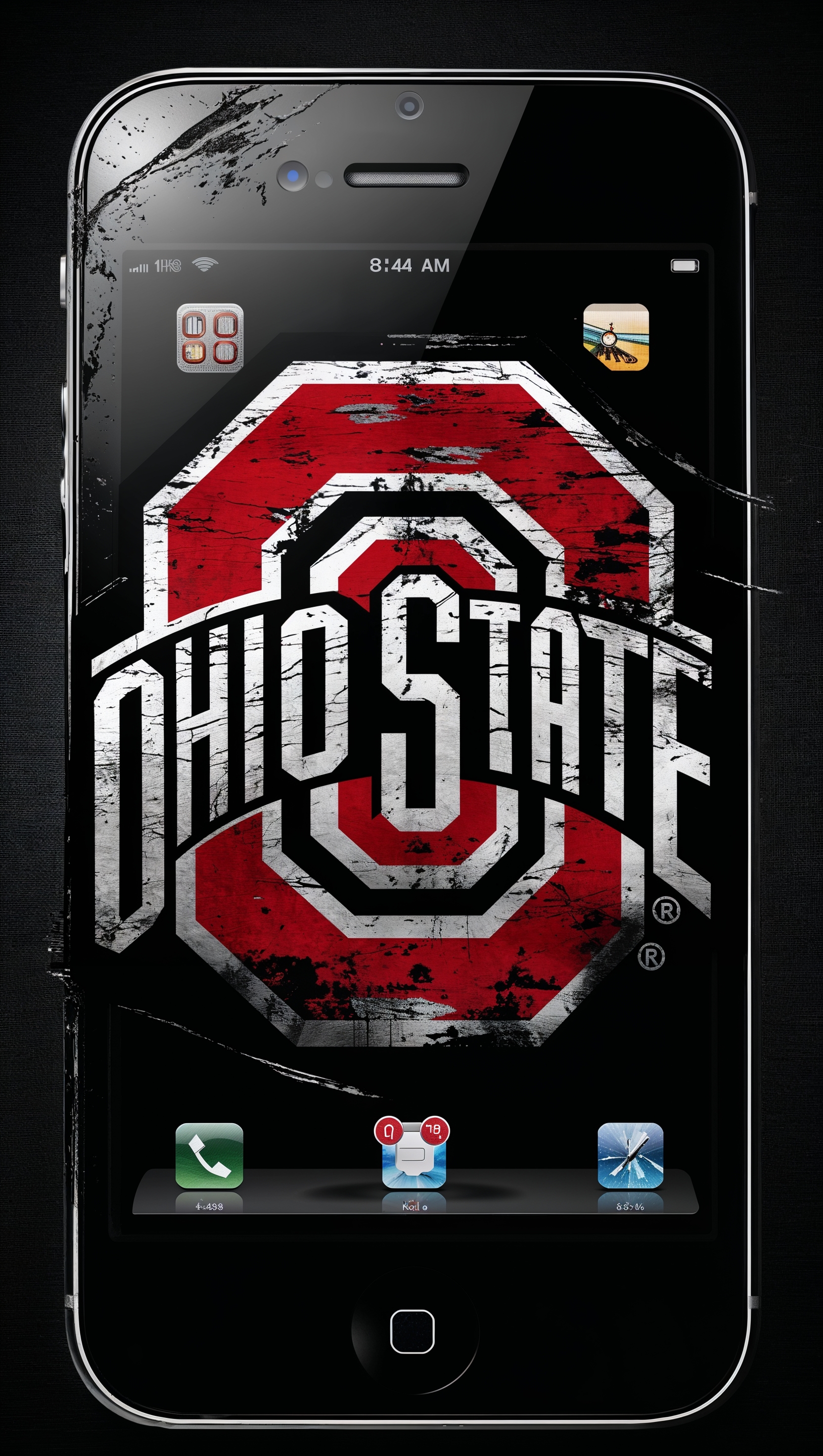 1664x2944 Ohio State Buckeyes logo with a grunge effect, centered on a black iPhone wallpaper