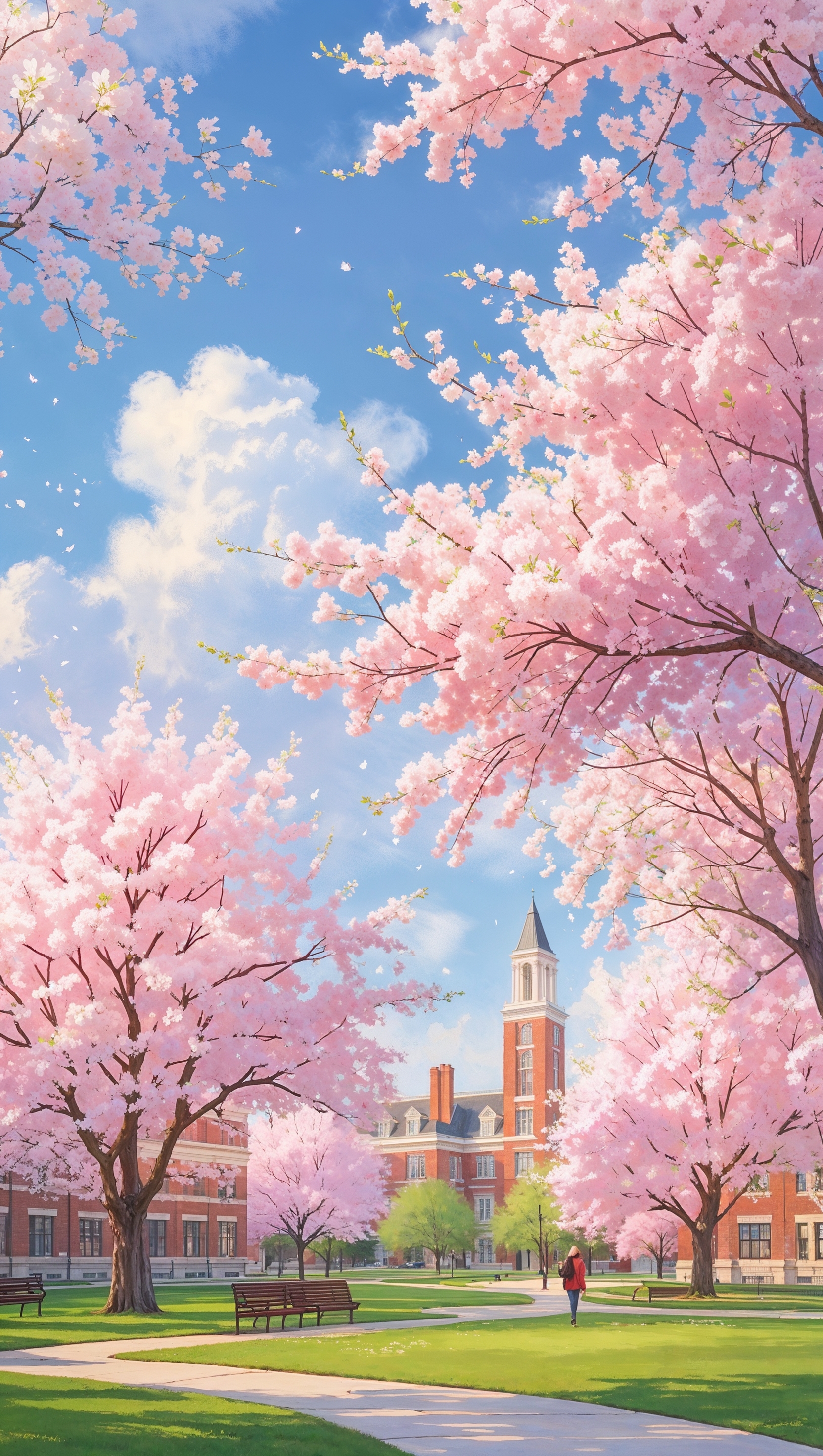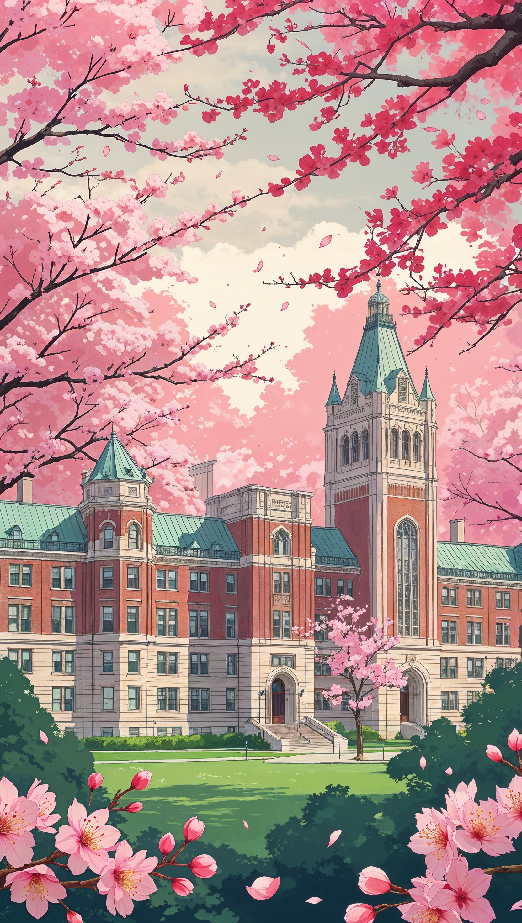 1664x2944 Anime-style Ohio State University with cherry blossoms, iPhone wallpaper
