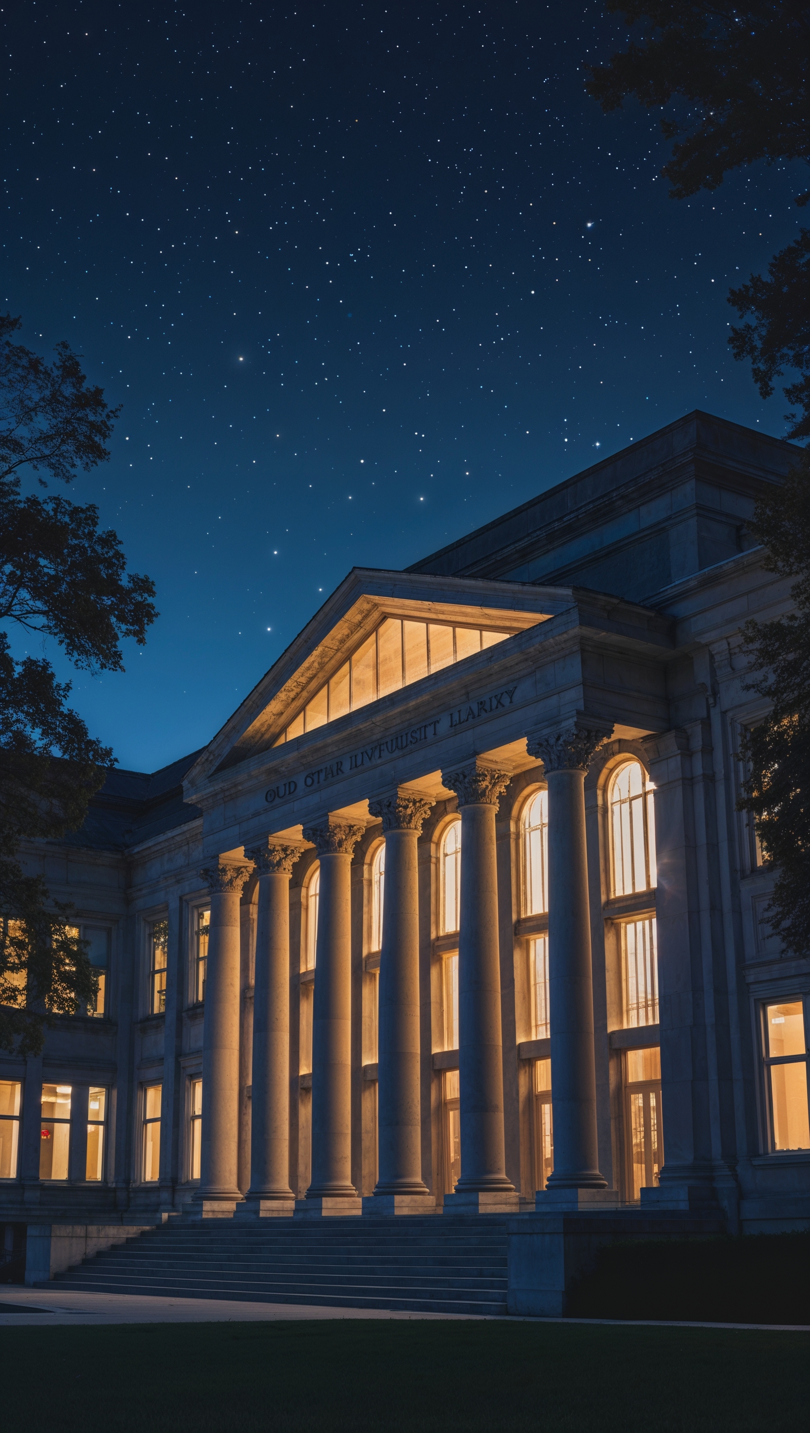 1664x2944 Ohio State University library at night with glowing windows, quiet mood, iPhone wallpaper