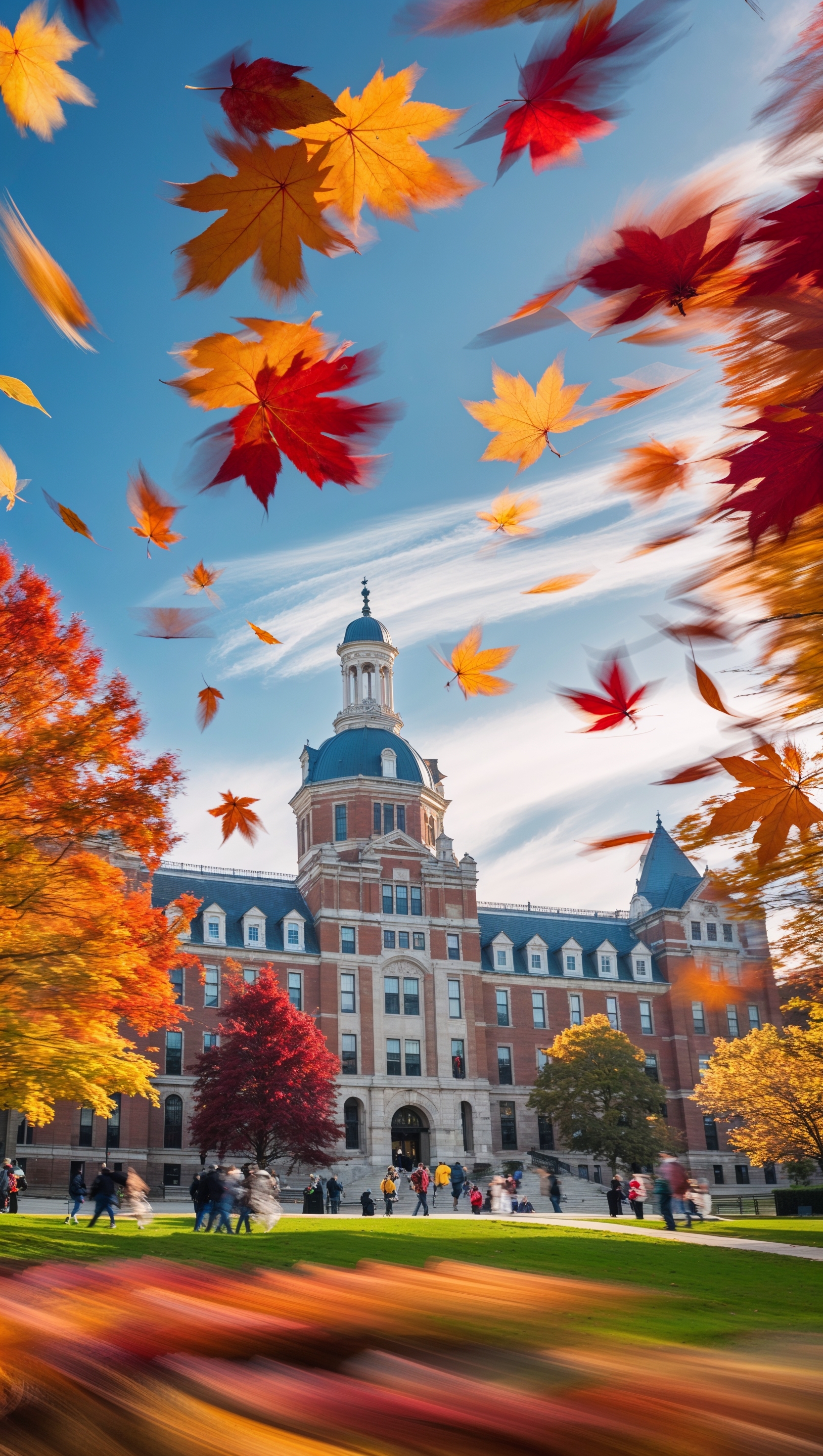 1664x2944 Ohio State campus with falling autumn leaves in motion blur, iPhone wallpaper