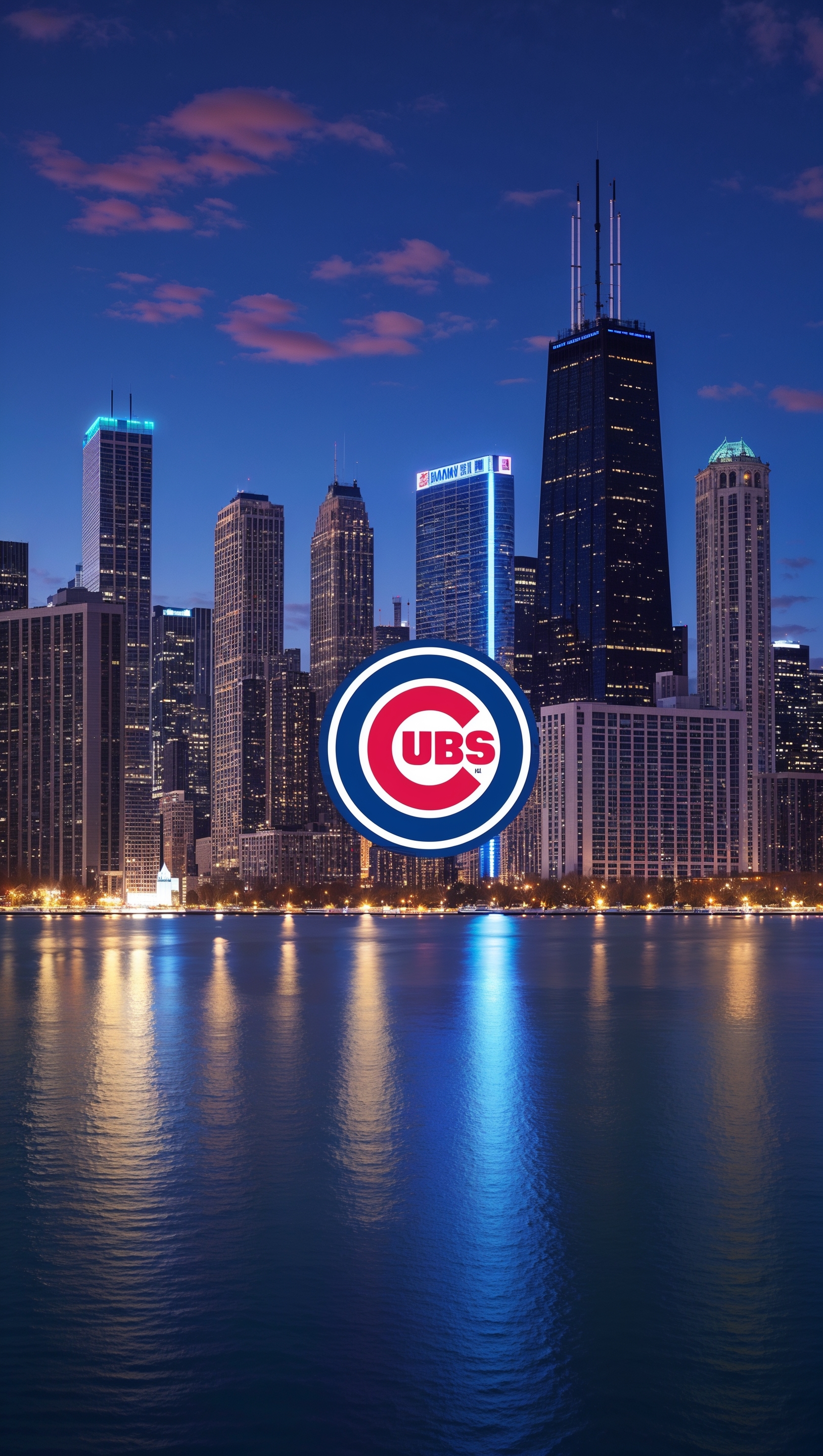 1664x2944 Chicago skyline at night with Cubs logo in the center