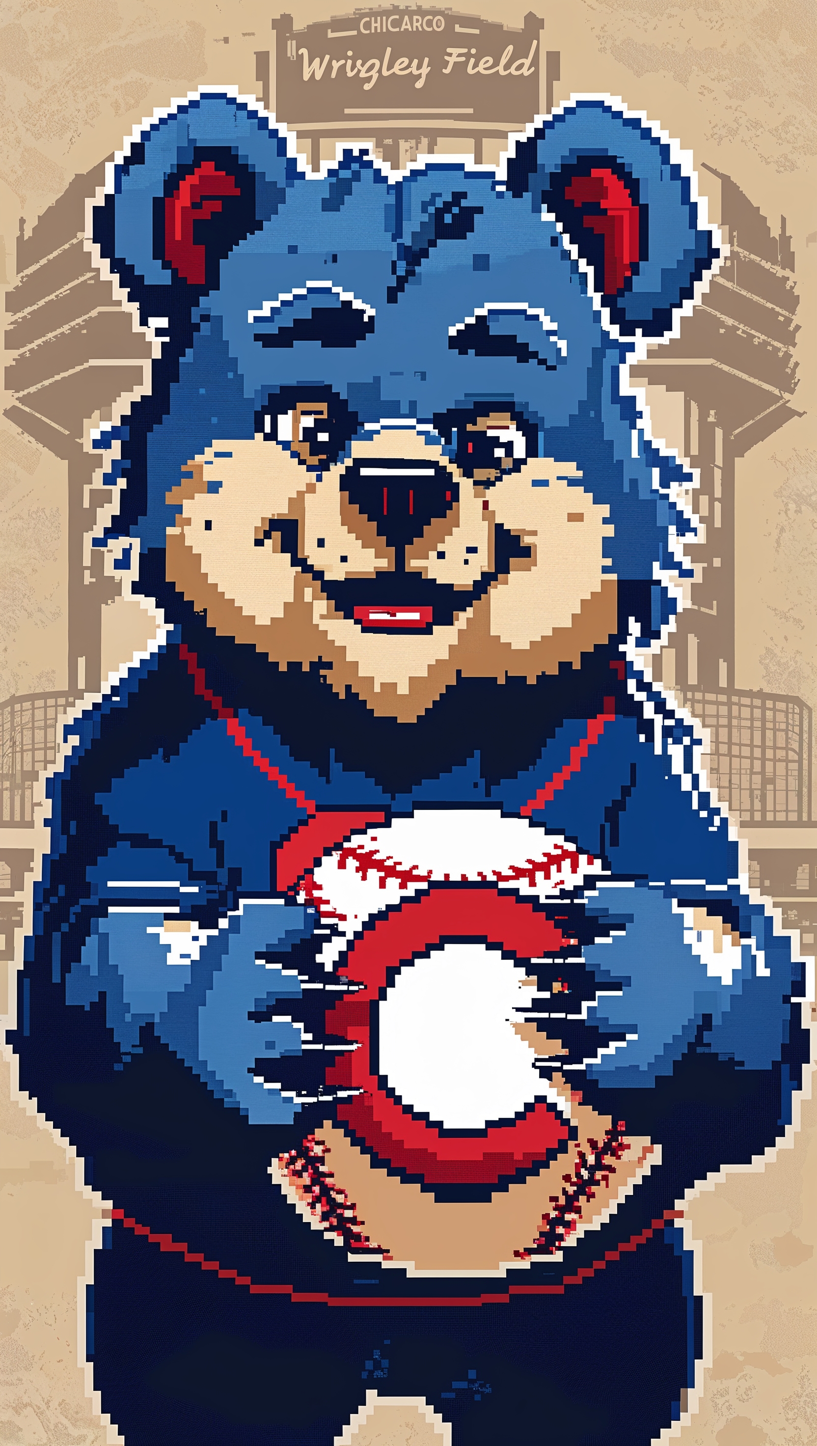 1664x2944 Pixel art of a bear and baseball in Chicago Cubs theme