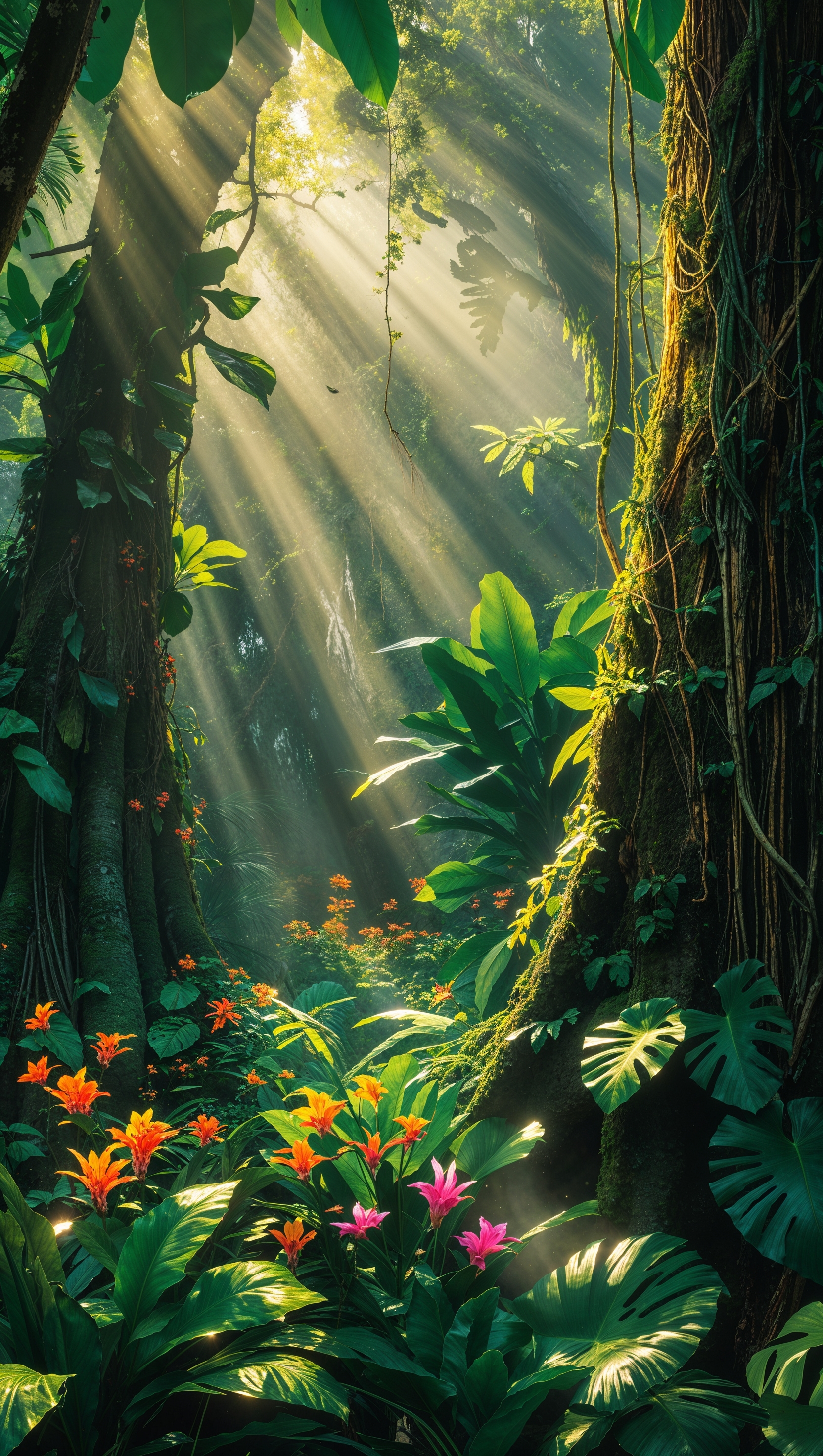 1664x2944 Tropical rainforest with sunlight filtering through leaves