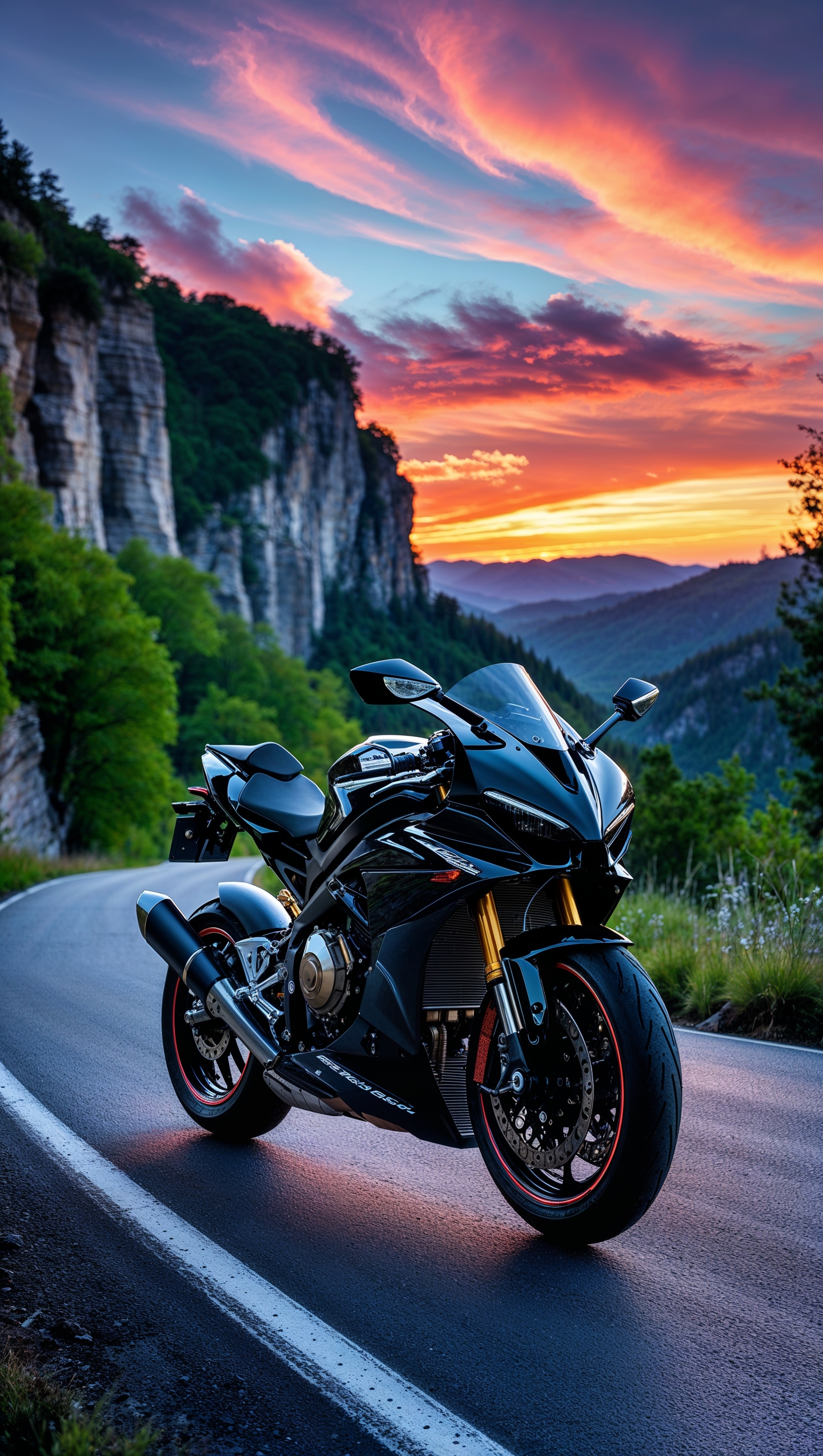 1664x2944 A sport motorcycle on a mountain road at sunset
