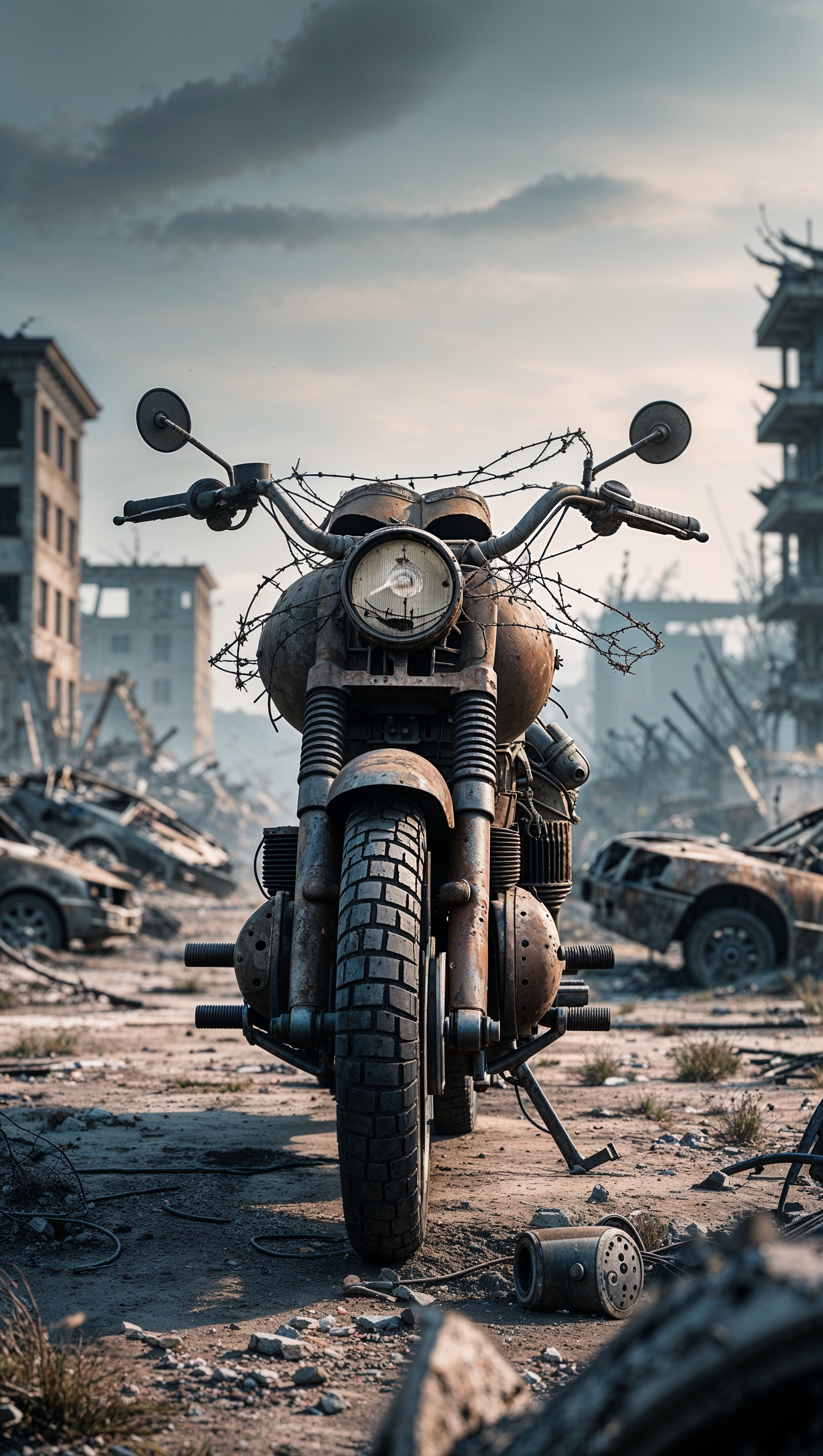 1664x2944 Military motorcycle in a post-apocalyptic battlefield