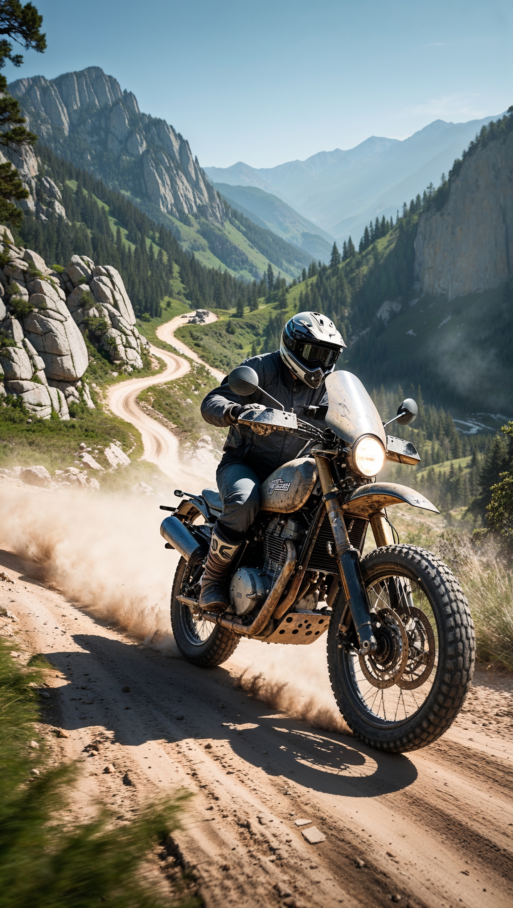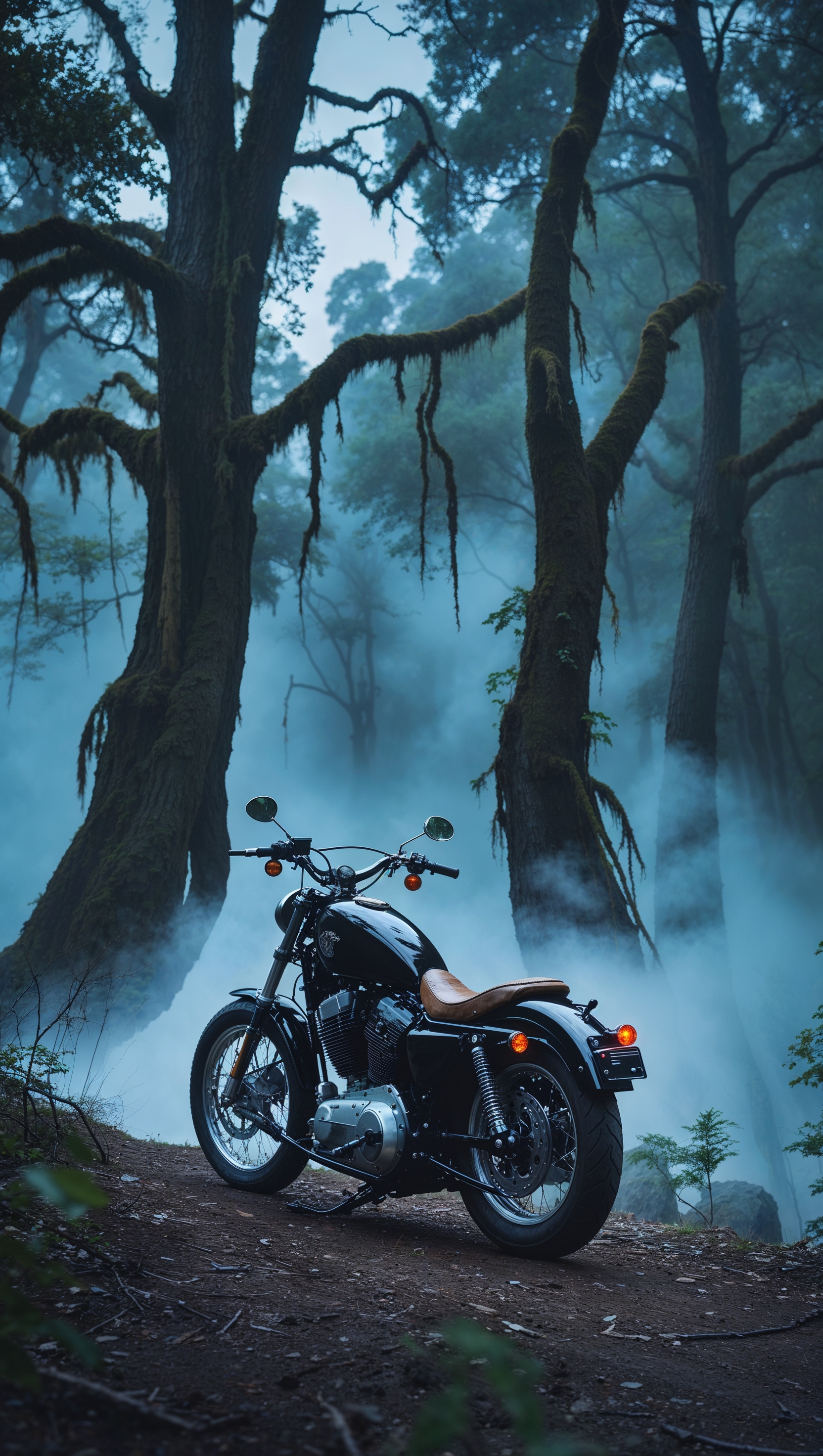 1664x2944 A motorcycle in a foggy forest with an adventurous vibe