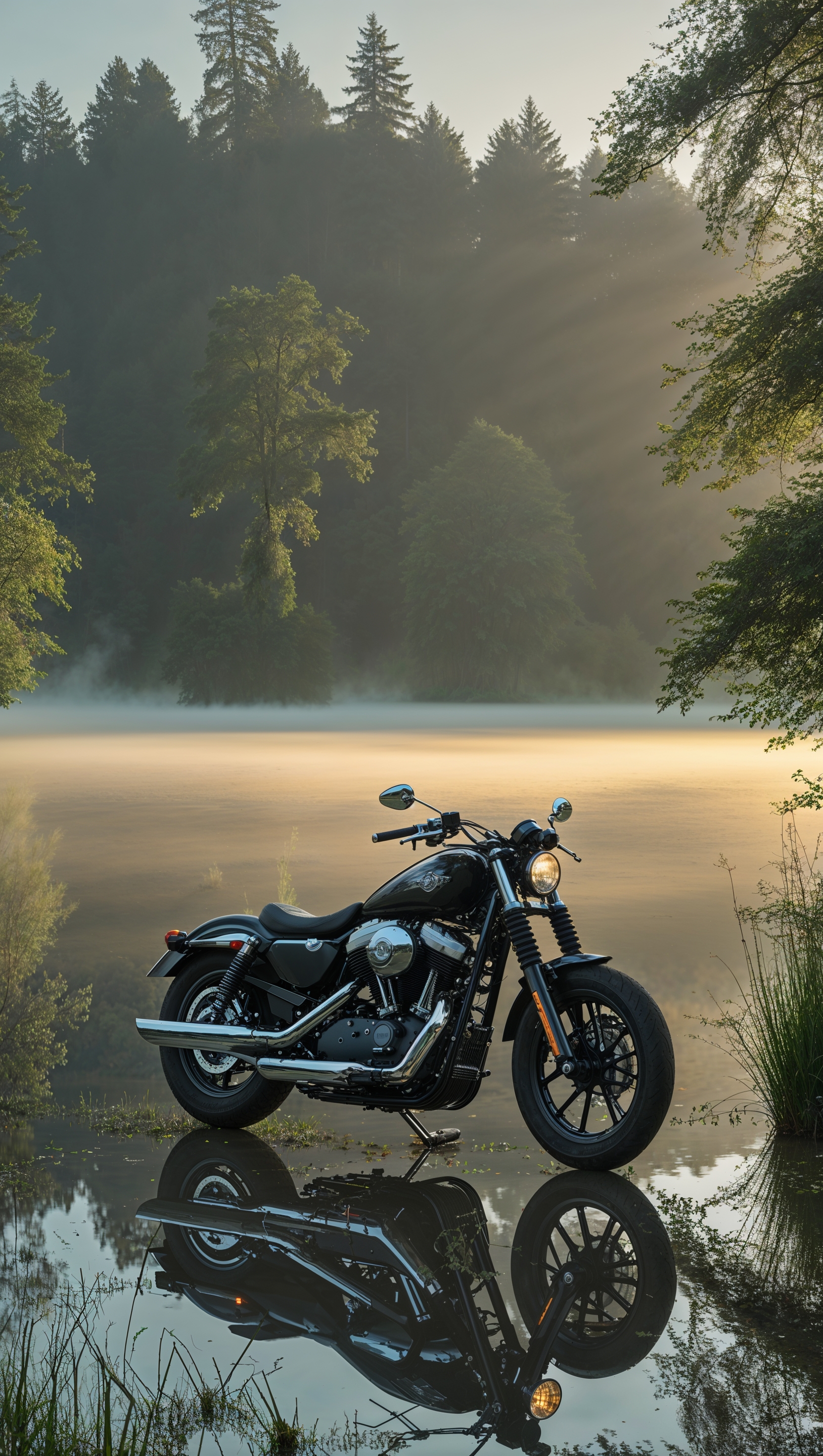 1664x2944 Motorcycle beside a calm lake in misty morning