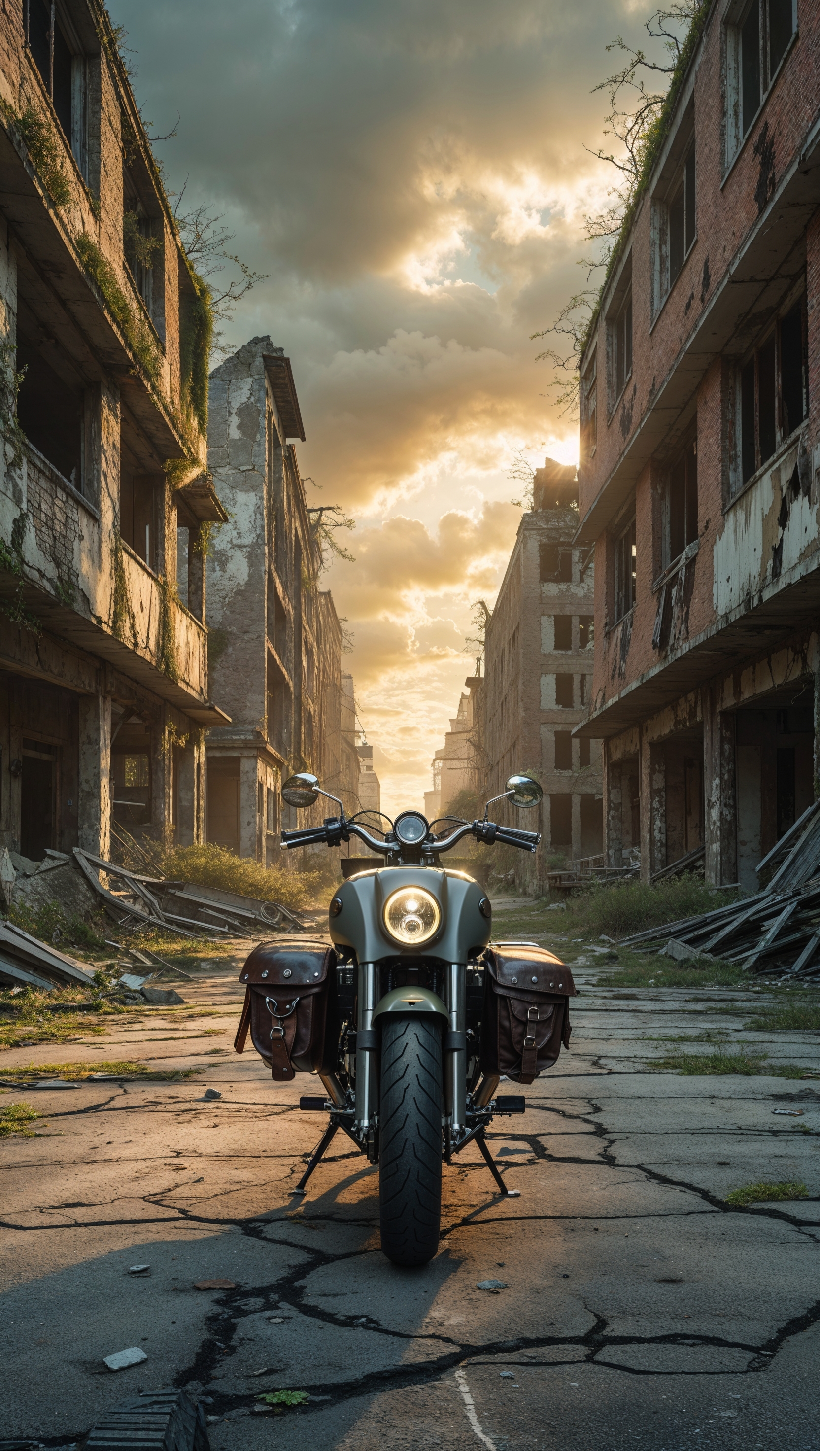 1664x2944 Motorcycle in an abandoned city with ruined buildings