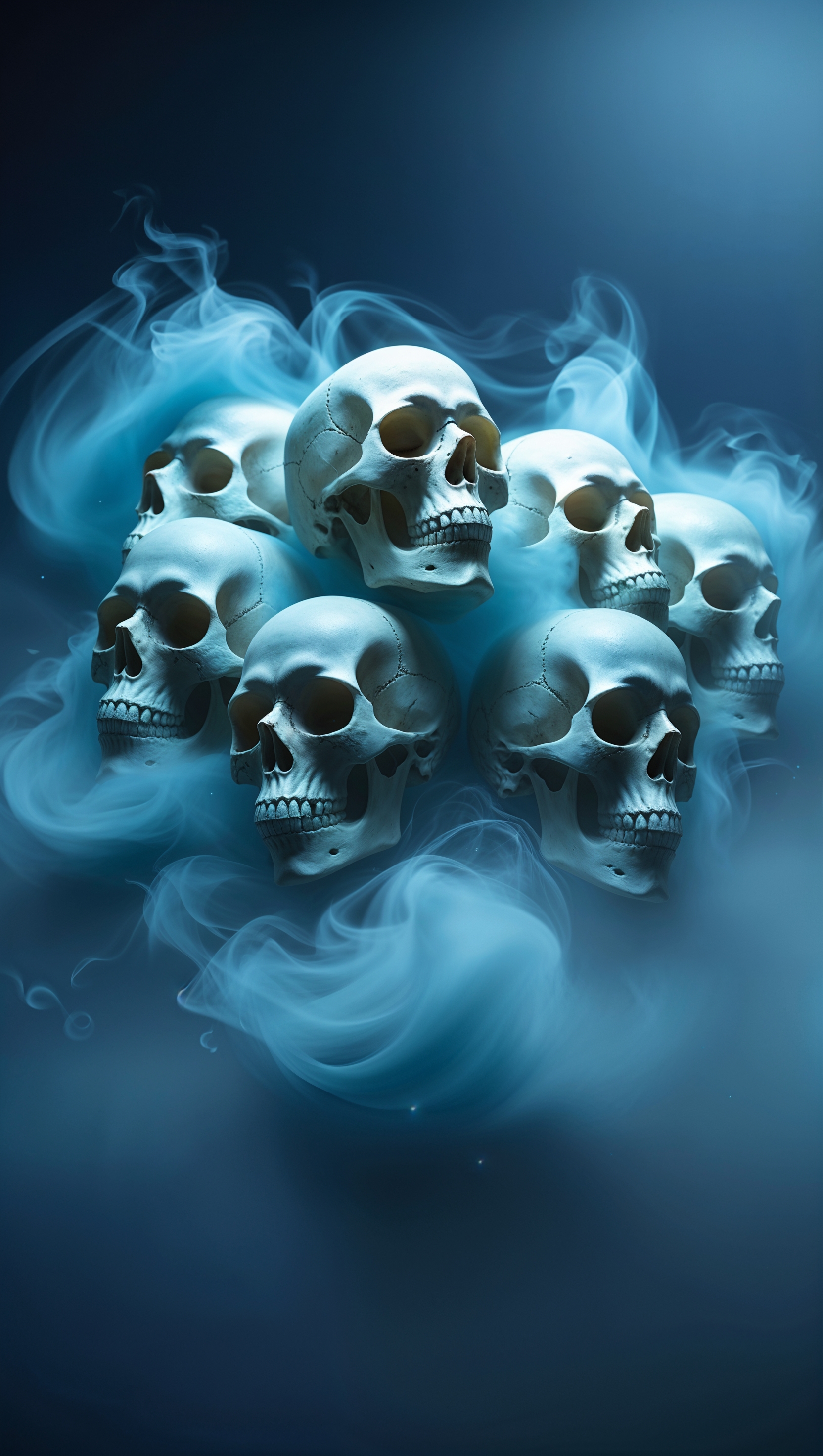 1664x2944 iPhone wallpaper with glowing skulls and blue mist