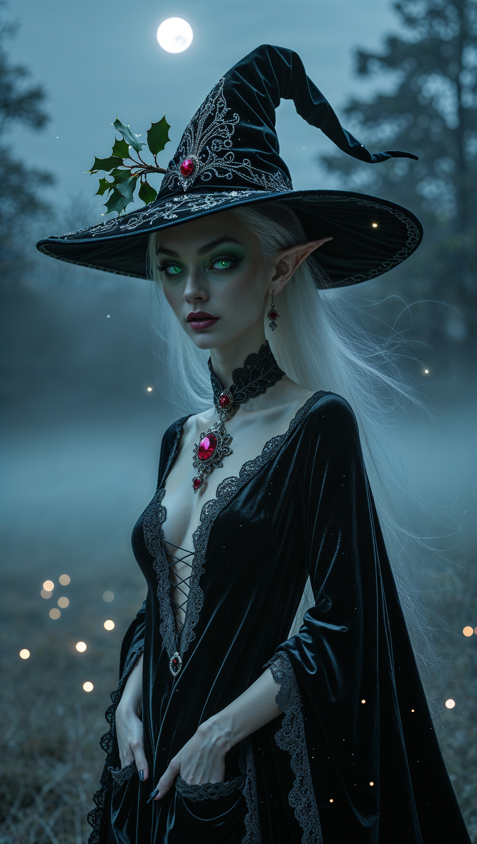 1664x2944 iPhone wallpaper with a witch wearing a tall hat on a foggy night