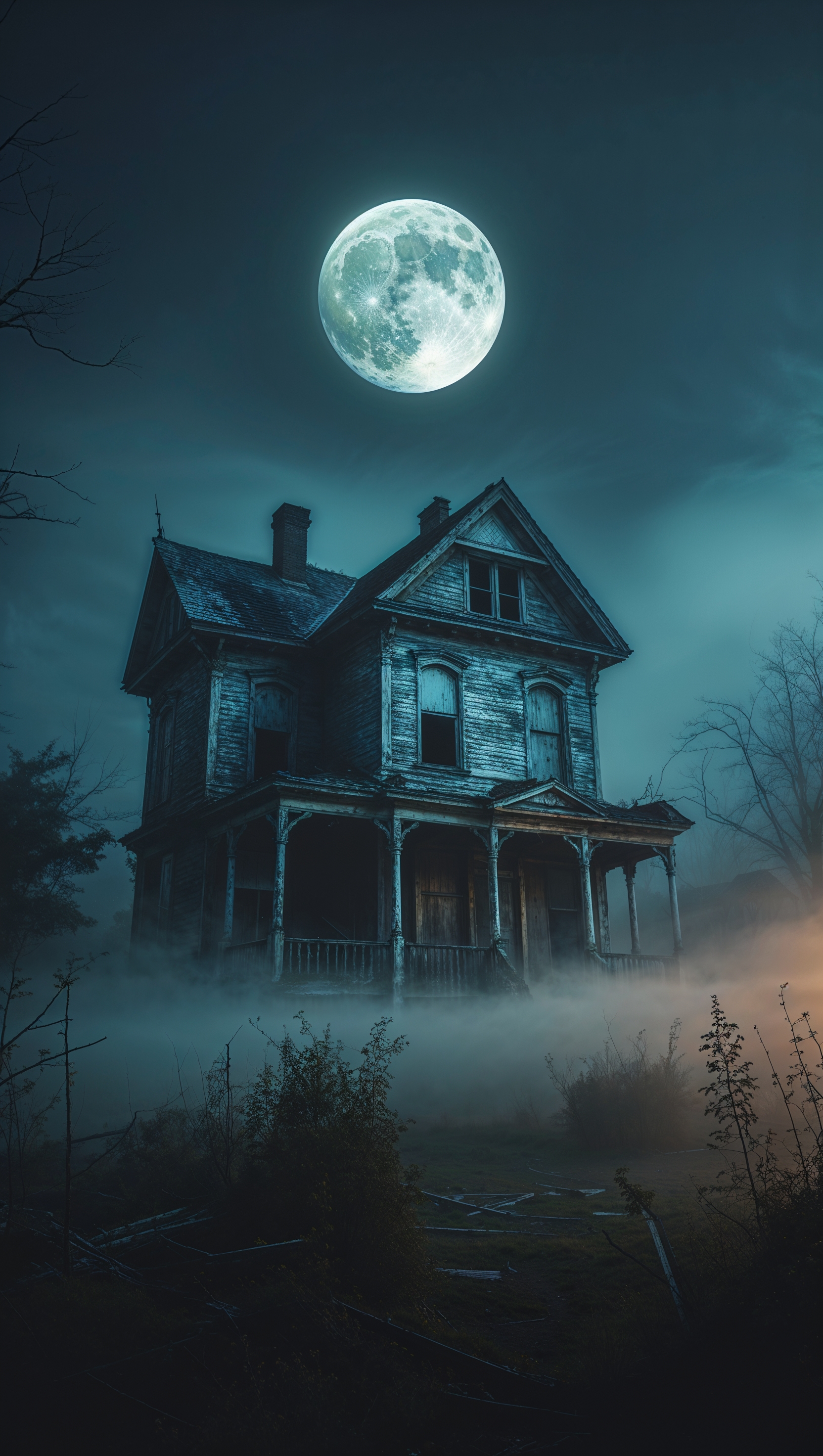 1664x2944 iPhone wallpaper with abandoned house on a foggy night and full moon
