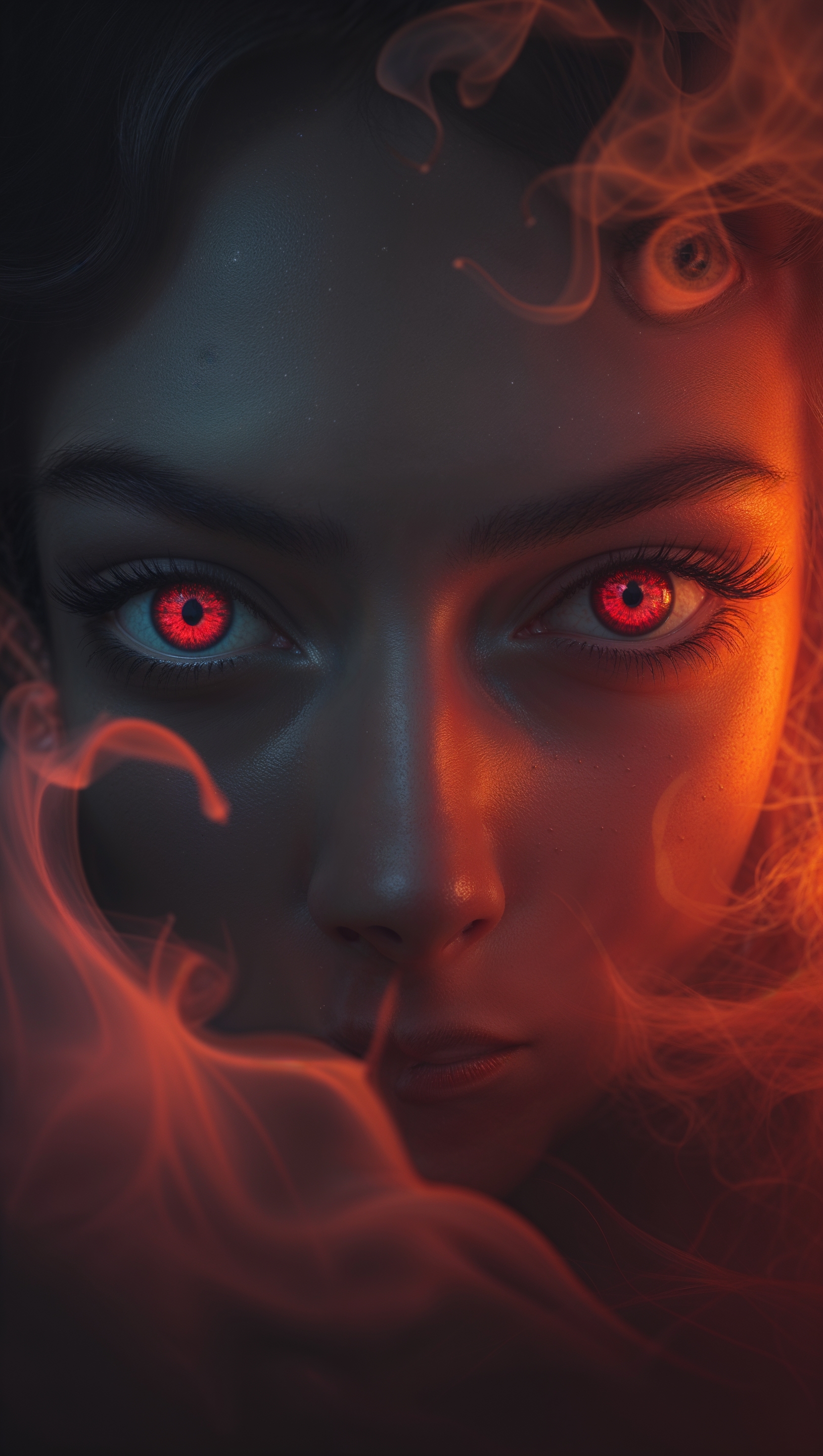1664x2944 iPhone wallpaper with red eyes in darkness and orange fog