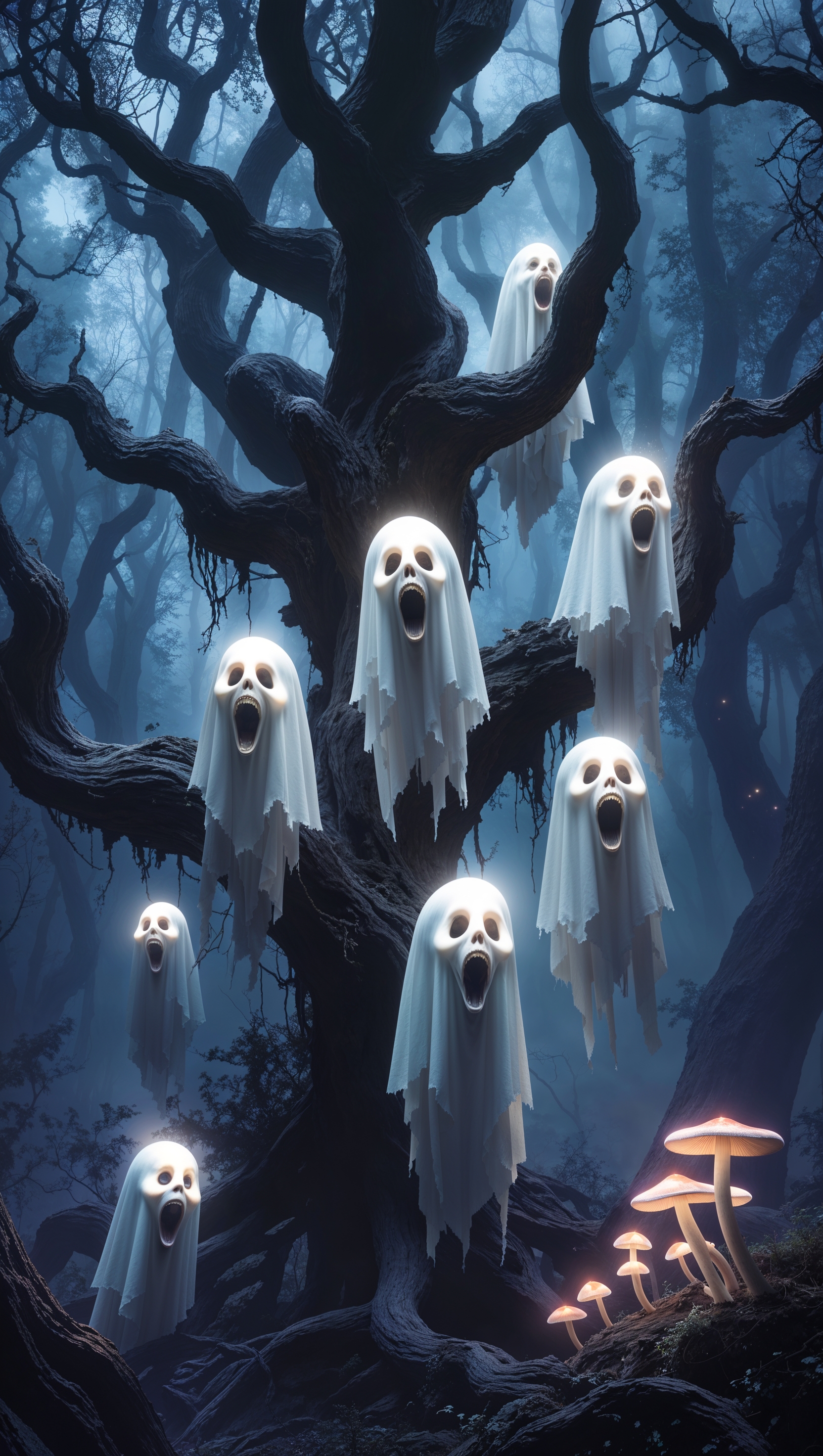 1664x2944 iPhone wallpaper with white ghosts in a dark forest