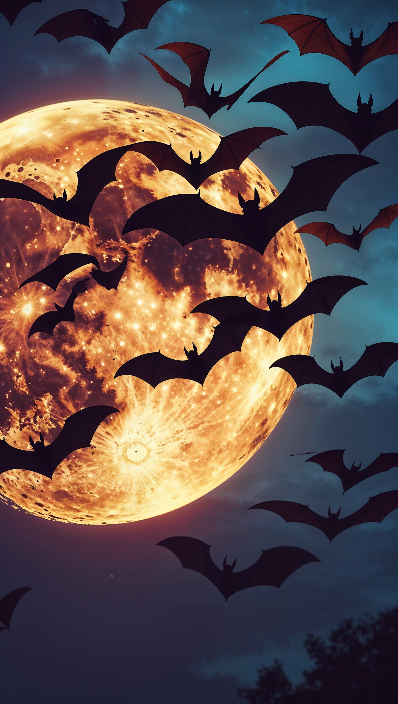 1664x2944 iPhone wallpaper with flying bats and orange full moon